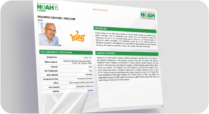 Social & Games RICCARDO ZACCONI |KING.COM CEO SPEAKER BIO Riccardo Zacconi is the CEO and co-founder of King, the world’s leading cross-platform social games developer. Prior to establishing King, Zacconi was vice president of sales and marketing in Europe for the successful dating service, uDate.com, and was instrumental in driving the market penetration and partnerships which led to the eventual buyout by InterActive Corporation (IAC). Before that, he was CEO for Spray Network, the online portal in Hamburg,with presencein Germany, France, Italy, Sweden, Denmark and Norway. KEY CORPORATE FACTS& KPIs COMPANY OVERVIEW Headquarters London, UK King.com, is a social games company, and the largest game developer ever in the history of Stockholm, Barcelona, Bucharest, Malmö, the website Facebook.com. King develops games for the web, for mobile (iOS, Android, Office Locations London, San Francisco, Malta Windows Phone), Facebook, and Windows 10. King is led by Riccardo Zacconi, who has Founded 2003 served in that role since co-founding the company in 2003. Founding partner Melvyn Morris serves as chairman. The company has 1400 employees and parcels development out to No of Employees 1,400 small, autonomous teams of designers working with a "startup" mentality. In 2013, it spent $110.5 million on research and development, roughly 6 percent of sales. On 26 March 2014, Active Markets Worldwide King completed its initial public offering (IPO). Priced at $22.50 a share, the middle of its Business Overview Social games developer projected price range, the IPO valued the company at US$7.08 billion. About $500 million was raised through the sale of 22.2 million shares. KPI #1 324m average monthly unique users Key Investors Went public in March 2014 Website king.com 44