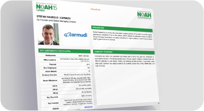 Classifieds STEFAN HAUBOLD| CARMUDI Co-Founder and Global Managing Director SPEAKER BIO Stefan Haubold is the co-founder and global managing director of Carmudi, the world’s fastest growing car classifieds. Prior to this venture, Stefan started his professional career at Roland Berger Strategy Consultants, a leading consulting firm, and founded an e-commerce company that he grew to €15m in revenue. KEY CORPORATE FACTS& KPIs COMPANY OVERVIEW Headquarters Berlin, Germany Carmudi is an online car classifieds that allows you to sell or buy your car, motorcycle or Office Locations 20 Countries in Asia, Africa, Middle East and commercial vehicle in the fastest possible way. You can search, compare, and purchase over Latin America 300,000 vehicles on your phone, making car shopping as easy as ever. In just under a year Founded 2013 and a half, Carmudi has rapidly scaled to 20 countries across Asia, Africa, Middle East, and Latin America. No of Employees 420 Active Markets 20 Business Overview World’s Fastest Growing Car Classifieds Launched an iOS app, secured a $25 million Recent Milestones round of funding, set a record of over 400k downloads and expanded into 20 countries KPI #1 5m monthly visitors KPI #2 65% of traffic via mobile KPI #3 10k Car Dealers KeyFinancials $35m of funding Asia Pacific Internet Group (a joint venture Key Investors between Rocket Internet and Ooredoo), Holtzbrinck Ventures, Tengelmann Ventures Website carmudi.com 16