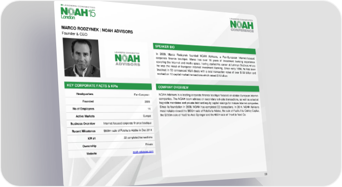 MARCO RODZYNEK | NOAH ADVISORS Founder & CEO SPEAKER BIO In 2009, Marco Rodzynek founded NOAH Advisors, a Pan-European Internet-focused corporate finance boutique. Marco has over 16 years of investment banking experience covering the Internet and media space, having started his career at Lehman Brothers where he was the Head of European Internet Investment Banking. Since early 1998, he has been involved in 50 announced M&A deals with a total transaction value of over $100 billion and worked on 10 capital market transactions which raised $16 billion KEY CORPORATE FACTS& KPIs COMPANY OVERVIEW Headquarters Pan-European NOAHAdvisors is a leading corporate finance boutique focused on sizable European Internet companies. The NOAH team advises on secondary sell-side transactions, as well as selected Founded 2009 buy-side mandates and private debt and equity capital raisings for mature Internet companies. No of Employees 14 Since its foundation in 2009, NOAH has completed 22 transactions. In 2014, NOAH Advisors most notably closed the $800m sale of Fotolia to Adobe, the sale of Facile.it to Oakley Capital, Active Markets Europe the $230msaleof Yad2 to Axel Springer and the €80m sale of Trovit to Next Co. Business Overview Internet-focused corporate finance boutique Recent Milestones $800m sale of Fotolia to Adobe in Dec 2014 KPI#1 22 completed transactions Ownership Private Website noah-advisors.com 59