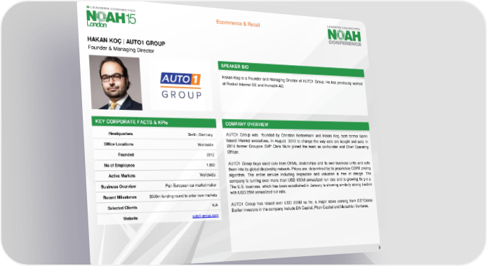 Ecommerce & Retail HAKANKOÇ| AUTO1 GROUP Founder & Managing Director SPEAKER BIO Hakan Koç is a Founder and Managing Director of AUTO1 Group. He has previously worked at Rocket Internet SE and Home24 AG. KEY CORPORATE FACTS& KPIs COMPANY OVERVIEW Headquarters Berlin, Germany AUTO1 Group was founded by Christian Bertermann and Hakan Koç, both former Berlin based internet executives, in August 2012 to change the way cars are bought and sold. In Office Locations Worldwide 2014 former Groupon SVP Chris Muhr joined the team as co-founder and Chief Operating Founded 2012 Officer. No of Employees 1,800 AUTO1 Group buys used cars from OEMs, dealerships and its own business units and sells them into its global dealership network. Prices are determined by its proprietary CORE pricing Active Markets Worldwide algorithm. The entire service including inspection and valuation is free of charge. The Business Overview Pan-European car market maker company is turning over more than USD 850M annualized run rate and is growing 8x y-o-y. The U.S. business which has been established in January is showing similarly strong traction Recent Milestones $500m funding round to enter new markets with USD 25M annualizedrun rate. Selected Clients N/A AUTO1 Group has raised over USD 200M so far, a major stake coming from DSTGlobal. Earlier investors in the company include DN Capital, Piton Capital and Mutschler Ventures. Website auto1-group.com 9