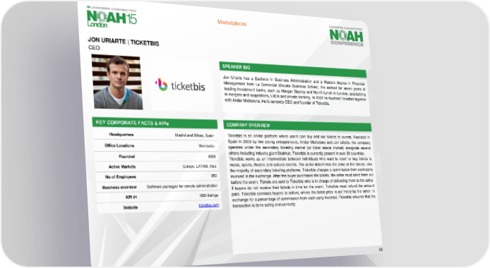 Marketplaces JON URIARTE | TICKETBIS CEO SPEAKER BIO Jon Uriarte has a Bachelor in Business Administration and a Masters degree in Financial Management from La Comercial (Deusto Business School). He worked for seven years at leading investment banks, such as Morgan Stanley and Merrill Lynch in London, specializing in mergers and acquisitions, LBOs and private banking. In 2009 he foudned Ticketbis together with Ander Michelena. He is currently CEO and founder of Ticketbis. KEY CORPORATE FACTS& KPIs COMPANY OVERVIEW Headquarters Madrid and Bilbao, Spain Ticketbis is an online platform where users can buy and sell tickets to events. Founded in Spain in 2009 by two young entrepreneurs, Ander Michelena and Jon Uriarte, the company Office Locations Worldwide operates under the secondary ticketing market (or ticket resale market) alongside several Founded 2009 others including industry giant Stubhub, Ticketbis is currently present in over 30 countries. Ticketbis works as an intermediate between individuals who want to resell or buy tickets to Active Markets Europe, LATAM, Asia music, sports, theatre and cultural events. The seller determines the price of the tickets. Like the majority of secondary ticketing platforms, Ticketbis charges a commission from each party No of Employees 350 involved in the exchange. After the buyer purchases the tickets, the seller must send them out Business overview Software packages for remote administration before the event. Tickets are sent to Ticketbis who is in charge of delivering them to the seller. If buyers do not receive their tickets in time for the event, Ticketbis must refund the amount KPI#1 162k listings paid. Ticketbis connects buyers to sellers, where the ticket price is set freely by the seller. In exchange for a percentage of commission from each party involved, Ticketbis ensures that the Website ticketbis.com transaction is done safely and correctly. 86
