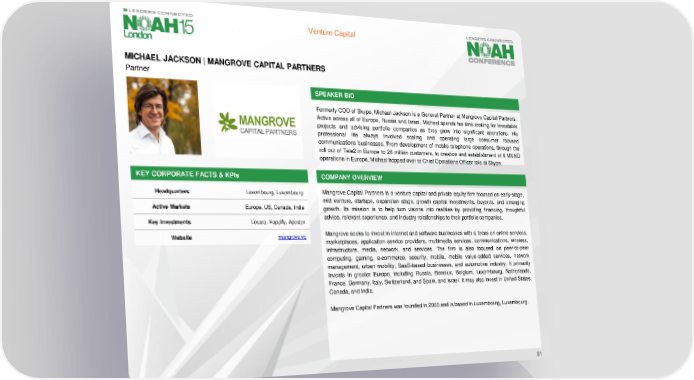 Venture Capital MICHAEL JACKSON| MANGROVE CAPITAL PARTNERS Partner SPEAKER BIO Formerly COO of Skype, Michael Jackson is a General Partner at Mangrove Capital Partners. Active across all of Europe, Russia and Israel, Michael spends his time looking for investable projects and advising portfolio companies as they grow into significant operations. His professional life always involved scaling and operating large consumer focused communications businesses. From development of mobile telephone operations, through the roll out of Tele2 in Europe to 26 million customers, to creation and establishment of 9 MVNO operations in Europe, Michael hopped over to Chief Operations Officer role at Skype. KEY CORPORATE FACTS& KPIs COMPANY OVERVIEW Headquarters Luxembourg, Luxembourg Mangrove Capital Partners is a venture capital and private equity firm focused on early-stage, mid venture, startups, expansion stage, growth capital investments, buyouts, and emerging Active Markets Europe, US, Canada, India growth. Its mission is to help turn visions into realities by providing financing, thoughtful Key Investments Lesara, Happify, Apester advice, relevant experience, and industry relationships to their portfolio companies. Website mangrove.vc Mangrove seeks to invest in internet and software businesses with a focus on online services, marketplaces, application service providers, multimedia services, communications, wireless, infrastructure, media, network, and services. The firm is also focused on peer-to-peer computing, gaming, e-commerce, security, mobile, mobile value-added services, network management, urban mobility, SaaS-based businesses, and automotive industry. It primarily invests in greater Europe, including Russia, Benelux, Belgium, Luxembourg, Netherlands, France, Germany, Italy, Switzerland, and Spain, and Israel. It may also invest in United States, Canada,andIndia. Mangrove Capital Partners was founded in 2000 and is based in Luxembourg, Luxembourg. 51