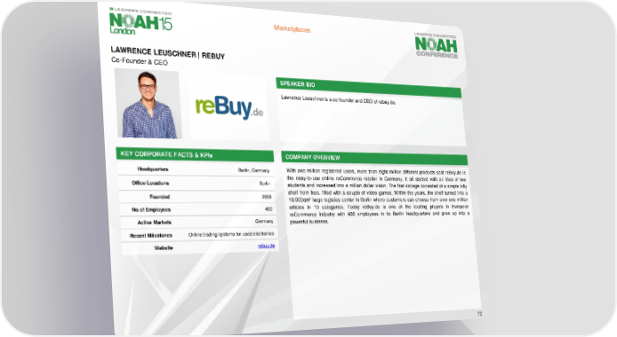 Marketplaces LAWRENCE LEUSCHNER| REBUY Co-Founder & CEO SPEAKER BIO Lawrence Leuschneris a co-founder and CEO of rebuy.de. KEY CORPORATE FACTS& KPIs COMPANY OVERVIEW Headquarters Berlin, Germany With one million registered users, more than eight million different products sold reBuy.de is the easy-to-use online reCommerce retailer in Germany. It all started with an idea of two Office Locations Berlin students and increased into a million dollar vision. The first storage consisted of a simple billy Founded 2009 shelf from ikea, filled with a couple of video games. Within the years, the shelf turned into a 10.000qm² large logistics center in Berlin where customers can choose from over one million No of Employees 400 articles in 10 categories. Today reBuy.de is one of the leading players in European reCommerce industry with 400 employees in its Berlin headquarters and grew up into a Active Markets Germany powerful business. Recent Milestones Online trading systems for used electronics Website rebuy.de 72
