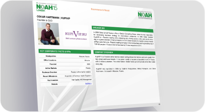 Ecommerce & Retail OSKAR HARTMANN| KUPIVIP Founder & CEO SPEAKER BIO In 2006 Oskar joined Russian office of Boston Consulting Group, where he was responsible for developing business strategy for international companies. In 2008 Oskar founded KupiVIP.ru – Russia’s leading online shopping club offering special online sale events every day on a great selection of fashion brands. In 2010 Oskar became the founder and co-investor of Fast Lane Ventures - Russia’s leading company in internet business and he joined the list of TOP-30peopleinRussianinternetbusinessby Forbes magazine in 2011. KEY CORPORATE FACTS& KPIs COMPANY OVERVIEW Headquarters Moscow, Russia KupiVIP is a Russian online fashion retailer selling discounted fashion and home goods from Office Locations Moscow high-street and luxury brands. It has grown rapidly to become a household name in Russia, with 6 million customers. The online fashion retailer hosts up to 20 private online flash sales Founded 2008 every day. Active Markets Russia KupiVIP was launched in 2008 by Vladimir Kholyaznikov, Mikhail Konoplev, and Oskar Business Overview Russian online fashion retailer Hartmann.It is based in Moscow, Russia. Recent Milestones Acquisition of footwear retailer Sapato.ru Key Investors Intel Capital, MCI Management Website kupivip.ru 46