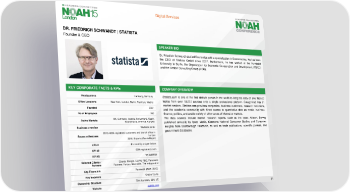 Digital Services DR. FRIEDRICH SCHWANDT| STATISTA Founder & CEO SPEAKER BIO Dr. Friedrich Schwandt studied Economics with a specialization in Econometrics. He has been the CEO of Statista GmbH since 2007. Furthermore, he has worked at the Humboldt University in Berlin, the Organization for Economic Co-operation and Development (OECD) andtheBostonConsultingGroup(BCG). KEY CORPORATE FACTS& KPIs COMPANY OVERVIEW Headquarters Hamburg, Germany Statista.com is one of the first statistic portals in the world to integrate data on over 80.000 Office Locations New York, London, Berlin, Frankfurt, Madrid topics from over 18.000 sources onto a single professional platform. Categorized into 21 Founded 2007 market sectors, Statista.com provides companies, business customers, research institutions, and the academic community with direct access to quantitative data on media, business, No of Employees 200 finance, politics, and a wide variety of other areas of interest or markets. Active Markets UK, Germany, Austria, Switzerland, Spain, The data sources include market research reports, such as the Ipsos Affluent Survey Scandinavia, America, Canada published annually by Ipsos Media, Simmons National Consumer Studies and Consumer Business overview Statistics portal Insights from Scarborough Research, as well as trade publications, scientific journals, and 2015: 600k registered customers and branch office in governmentdatabases. Recent milestones London 2016: Branch office in Madrid KPI #1 4m monthly unique visitors KPI #2 600k registered users KPI #3 1m statistics Selected Clients / Clients: Google, ESPN, P&G, Panasonic Partners Partners: Forbes, Mashable, The Independent Key Financials Revenues $16m (2015) Key Investors Grazia Equity Ownership Structure 70% founders, 30% VC Website statista.com 81