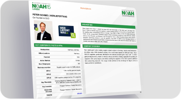 Marketplaces PETER SCHMID| WERLIEFERTWAS Co-Founder & CEO SPEAKER BIO Since August 2012 Peter F. Schmid has been CEO and shareholder of “Wer liefert was”. He brings more than 17 years of Internet experience gained in various leading positions. He was CEO of PARSHIP GmbH, the leading online matchmaking service in Europe. From 2006 to 2009, as CEO of mobile.international GmbH, he led, among others, Germany’s largest vehicle marketplace mobile.de. At the same time, Schmid acted as Vice President and Member of the management team at eBay Classifieds Group, which supports classified advertising markets in over 20 countries. From 2001 to 2005 he was Managing Director of AutoScout24 and founded Scout24 Media. Schmid started his career at the end of the nineties with Procter & Gambleandholds an MBA fromLMU in Munich. KEY CORPORATE FACTS& KPIs COMPANY OVERVIEW Headquarters Hamburg, Germany “Wer liefert was” is the leading supplier search engine in Germany, Austria and Switzerland. Office Locations Hamburg 24 million visits (IVW checked) making it the most-visited website for B2B purchases. About 530,000 suppliers, producers, distributors and service providers get in touch with 1.6 million Founded 1932 genuine buyers every month on wlw.de, wlw.at and wlw.ch. Being a specialist in searching for suppliers wlw saves buyers and others looking for suppliers in the B2B segment additional Active Markets Europe time-consuming research. The range of wlw services is free of charge for buyers and as a No of Employees 200 basic profile for advertisers. Business overview Supplier search engine for B2B products KPI#1 1.6m monthly genuine buyers KPI #2 24m website visits a year KPI #3 530k suppliers categorized by 47k categories KeyFinancials Growing Revenue: Between €35m – €40m in 2015, EBITDA: Double digit profitability rate Key Investors Paragon Partners / Nordic Mezzanine Ownership Paragon Partners / Nordic Mezzanine Structure Website wlw.com 92