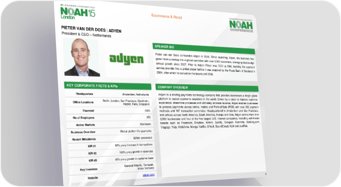 Ecommerce & Retail PIETER VAN DER DOES | ADYEN President & CEO – Netherlands SPEAKER BIO Pieter van der Does co-founded Adyen in 2006. Since launching Adyen, the business has grown from a startup into a global operation with over 3,500 customers, averaging double-digit annual growth since 2007. Prior to Adyen Pieter was CCO at Bibit, building the payment service provider into a global player before it was acquired by the Royal Bank of Scotland in 2004, after which he served on the board until 2006. KEY CORPORATE FACTS& KPIs COMPANY OVERVIEW Headquarters Amsterdam, Netherlands Adyen is a leading payments technology company that provides businesses a single global Berlin, London, San Francisco, Stockholm, platform to accept payments anywhere in the world. Driven by a vision to improve customer Office Locations Madrid, Paris, Singapore experience, streamline processes and ultimately increase revenue, Adyen enables businesses to process payments across online, mobile and Point-of-Sale (POS) with over 250 payment Founded 2006 methods and 187 transaction currencies. Headquartered in Amsterdam and San Francisco, No of Employees 250 with offices across North America, South America, Europe and Asia, Adyen serves more than 3,500 businesses and four of the five largest U.S. Internet companies, including well-known Active Markets Worldwide brands such as Facebook, Dropbox, Airbnb, Spotify, Groupon, Evernote, Booking.com, Viagogo, Yelp, Vodafone, Mango, Netflix, O’Neill, SoundCloud, KLM and JustFab. Business Overview Global platform for payments Recent Milestones $25bn processed KPI#1 80% y-o-y increase in transactions KPI #2 100% y-o-y growth in revenues KPI #3 40% y-o-y growth in customer base Key Investors General Atlantic, Temasek, Index Ventures Website adyen.com 4