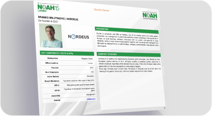 Social & Games BRANKO MILUTINOVIC | NORDEUS Co-Founder & CEO SPEAKER BIO Branko is co-founder and CEO at Nordeus, one of the leading social and mobile games companies. As a college hire he joined Microsoft Dev Center Copenhagen, the largest one in Europe, to build business software. Impressed with the growth and potential of social networks, led by a boy’s dream to build games, together with his friends and colleagues from Microsoft he returned home to build Nordeus, company behind World’s most popular online sports game. KEY CORPORATE FACTS& KPIs COMPANY OVERVIEW Headquarters Belgrade, Serbia Nordeus is a leading and award-winning European game developer, and officially the best European gaming start-up of 2011. Nordeus provides a seamless gaming experience to Office Locations London millions of people, regardless of the devices they are using. That is why Nordeus makes online Founded 2010 gamesthatarefree andaccessibleto a wide range of people. Every day, Nordeus team of more than 100 people in Belgrade puts all of their talent into No of Employees 100 making5-star games. Every day, millions of people enjoy what we have created. Active Markets Worldwide Recent Milestones TopEleven reached 100m users in May 2015 KPI#1 Best gaming start-up at Europas awards KPI #2 Top eleven is Facebook’s most played sports game Ownership Management Website nordeus.com 61