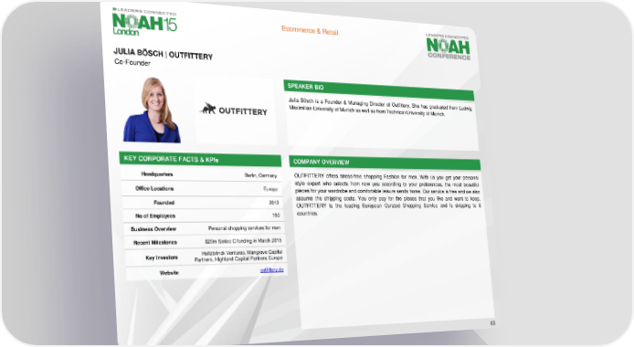 Ecommerce & Retail JULIA BÖSCH| OUTFITTERY Co-Founder SPEAKER BIO Julia Bösch is a Founder & Managing Director of Outfittery. She has graduated from Ludwig Maximilian University of Munich as well as from Technical University of Munich. KEY CORPORATE FACTS& KPIs COMPANY OVERVIEW Headquarters Berlin, Germany OUTFITTERY offers stress-free shopping Fashion for men. With us you get your personal style expert who selects from now you according to your preferences, the most beautiful Office Locations Europe pieces for your wardrobe and comfortable leisure sends home. Our service is free and we also Founded 2012 assume the shipping costs. You only pay for the pieces that you like and want to keep. OUTFITTERY is the leading European Curated Shopping Service and is shipping to 8 No of Employees 150 countries. Business Overview Personal shopping services for men Recent Milestones $20mSeriec C funding in March 2015 KeyInvestors Holtzbrinck Ventures, Mangrove Capital Partners, Highland Capital Partners Europe Website outfittery.de 65