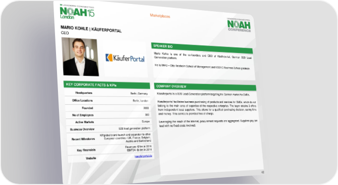 Marketplaces MARIO KOHLE| KÄUFERPORTAL CEO SPEAKER BIO Mario Kohle is one of the co-founders and CEO of Käuferportal, German B2B Lead Generation platform. HeisWHU–OttoBeisheimSchoolofManagementandESSECBusinessSchoolgraduate. KEY CORPORATE FACTS& KPIs COMPANY OVERVIEW Headquarters Berlin, Germany Kaeuferportal is a B2B Lead Generation platform targeting the German market for SMEs. Office Locations Berlin, London Kaeuferportal facilitates business purchasing of products and services for SMEs, which do not Founded 2008 belong to the main area of expertise of the respective enterprise. The buyer obtains 3 offers from independent local suppliers. This allows for a qualified purchasing decision, saving time No of Employees 300 andmoney.This service is provided free of charge. Active Markets Europe Leveraging the reach of the internet, procurement requests are aggregated. Suppliers pay per Business Overview B2B lead generation platform lead with no fixed costs involved. KPglobal brand launch and expansion to other Recent Milestones European countries - UK, France, Belgium, Austria and Switzerland KeyFinancials Revenues €21m in 2014 EBITDA €0.8m in 2014 Website kaeuferportal.de 42