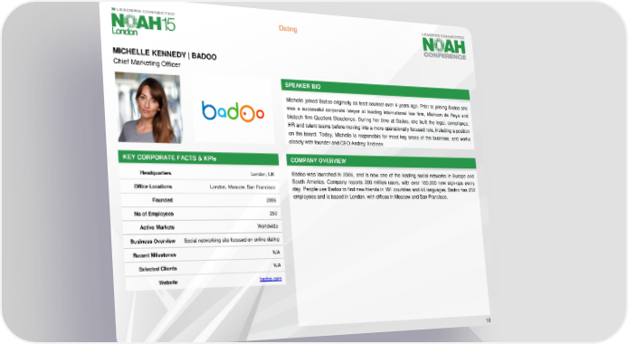 Dating MICHELLE KENNEDY | BADOO Chief Marketing Officer SPEAKER BIO Michelle joined Badoo originally as lead counsel over 4 years ago. Prior to joining Badoo she was a successful corporate lawyer at leading international law firm, Mishcon de Reya and biotech firm Quotient Bioscience. During her time at Badoo, she built the legal, compliance, HRandtalent teams before moving into a more operationally focused role, including a position on the board. Today, Michelle is responsible for most key areas of the business, and works closely with founder and CEO Andrey Andreev. KEY CORPORATE FACTS& KPIs COMPANY OVERVIEW Headquarters London, UK Badoo was launched in 2006, and is now one of the leading social networks in Europe and South America. Company reports 200 million users, with over 100,000 new sign-ups every Office Locations London, Moscow, San Francisco day. People use Badoo to find new friends in 191 countries and 44 languages. Badoo has 250 Founded 2006 employeesandisbasedinLondon,with offices in Moscow and San Francisco. No of Employees 250 Active Markets Worldwide Business Overview Social networking site focused on online dating Recent Milestones N/A Selected Clients N/A Website badoo.com 10