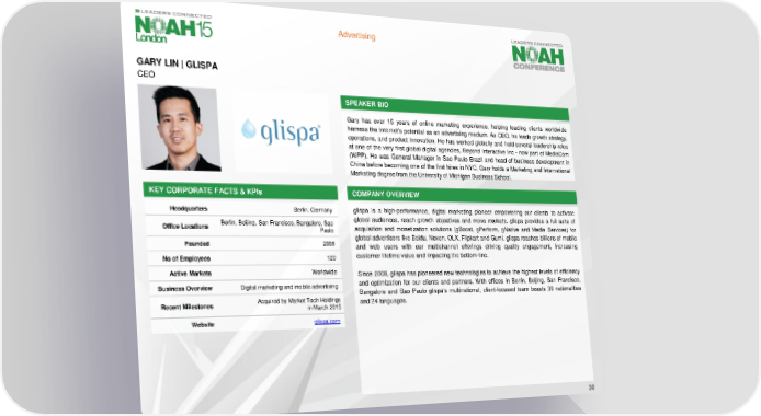Advertising GARY LIN| GLISPA CEO SPEAKER BIO Gary has over 15 years of online marketing experience, helping leading clients worldwide harness the Internet’s potential as an advertising medium. As CEO, he leads growth strategy, operations, and product innovation. He has worked globally and held several leadership roles at one of the very first global digital agencies, Beyond Interactive Inc - now part of MediaCom (WPP). He was General Manager in Sao Paulo Brazil and head of business development in China before becoming one of the first hires in NYC. Gary holds a Marketing and International Marketing degree from the University of Michigan Business School. KEY CORPORATE FACTS& KPIs COMPANY OVERVIEW Headquarters Berlin, Germany glispa is a high-performance, digital marketing pioneer empowering our clients to activate Berlin, Beijing, San Francisco, Bangalore, Sao global audiences, reach growth objectives and move markets. glispa provides a full suite of Office Locations Paulo acquisition and monetization solutions (gBoost, gPerform, gNative and Media Services) for Founded 2008 global advertisers like Baidu, Nexon, OLX, Flipkart and Gumi. glispa reaches billions of mobile and web users with our multichannel offerings driving quality engagement, increasing No of Employees 120 customerlifetime value and impacting the bottom-line. Active Markets Worldwide Since 2008, glispa has pioneered new technologies to achieve the highest levels of efficiency Business Overview Digital marketing and mobile advertising and optimization for our clients and partners. With offices in Berlin, Beijing, San Francisco, Bangalore and Sao Paulo glispa’s multinational, client-focused team boasts 39 nationalities Recent Milestones Acquired by Market Tech Holdings and24languages. in March 2015 Website glispa.com 30