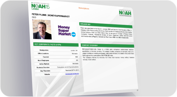 Marketplaces PETER PLUMB | MONEYSUPERMARKET CEO SPEAKER BIO Peter was appointed to the Board in January 2009 and became Chief Executive Officer in February 2009. Prior to joining the Group, Peter was the UK managing director of dunnhumby Limited between 2006 and 2008. Before that, he was general manager of Europe Disney Consumer Products, international director of Dyson Appliances Limited and held senior commercialroles at PepsiCo International.Peter has an MBA from IMD in Switzerland. KEY CORPORATE FACTS& KPIs COMPANY OVERVIEW Moneysupermarket.com Group is a British price comparison website-based business Headquarters London, UK specialising in financial services. The website enables consumers to compare prices on a Office Locations Worldwide range of products, including mortgages, credit cards and loans. It is listed on the London Stock Exchangeandisaconstituentofthe FTSE 250Index. Founded 1999 The Company derives its revenues from three main sources: money vertical, insurance No of Employees 500 vertical, travel vertical. Active Markets Worldwide Business Overview Comparison site for financial products Key Financials Revenues $377m (2014) Website moneysupermarket.com 57