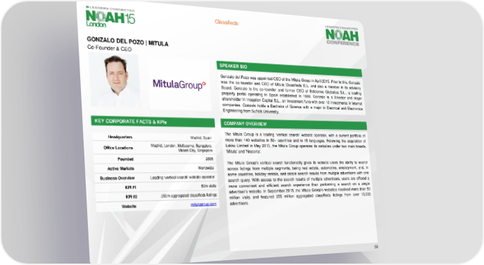 Classifieds GONZALO DEL POZO| MITULA Co-Founder & CEO SPEAKER BIO Gonzalo del Pozo was appointed CEO of the Mitula Group in April 2015. Prior to this, Gonzalo was the co-founder and CEO of Mitula Classifieds S.L. and also a member in its advisory Board. Gonzalo is the co-founder and former CEO of Ediciones Globaliza S.L., a leading property portal operating in Spain established in 1998. Gonzalo is a Director and major shareholder in Inception Capital S.L., an investment fund with over 10 investments in internet companies. Gonzalo holds a Bachelor of Science with a major in Electrical and Electronics Engineering from Suffolk University. KEY CORPORATE FACTS& KPIs COMPANY OVERVIEW The Mitula Group is a leading ‘vertical search’ website operator, with a current portfolio of Headquarters Madrid, Spain more than 140 websites in 50+ countries and in 15 languages. Following the acquisition of Office Locations Madrid, London, Melbourne, Bangalore, Lokku Limited in May 2015, the Mitula Group operates its websites under two main brands, Makati City, Singapore ‘Mitula’ and ‘Nestoria’. Founded 2008 The Mitula Group’s vertical search functionality gives its website users the ability to search Active Markets Worldwide across listings from multiple segments, being real estate, automotive, employment, and, in Business Overview Leading ‘vertical search’ website operator some countries, holiday rentals, and obtain search results from multiple advertisers with one search query. With access to the search results of multiple advertisers, users are offered a KPI#1 50m visits more convenient and efficient search experience than performing a search on a single KPI#2 255maggregated classifieds listings advertiser’s website. In September 2015, the Mitula Group’s websites received more than 50 million visits and featured 255 million aggregated classifieds listings from over 13,000 Website mitulagroup.com advertisers. 56