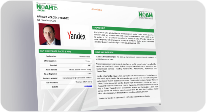 Advertising ARKADYVOLOZH| YANDEX Co-Founder & CEO SPEAKER BIO Arkady Volozh is the principal founder of Russian search engine Yandex. He has been the company’s CEO and a director since 2000. Arkady founded Yandex in 1997; in 2000, he left his position of CEO at CompTek International to become the CEO of Yandex. Volozh is a serial entrepreneur with a background in computer science. He studied applied mathematics at Gubkin Russian State University of Oil and Gas, graduating in 1986. KEY CORPORATE FACTS& KPIs COMPANY OVERVIEW Headquarters Moscow, Russia Yandex is a Russian company that offers an internet search engine and search solutions to a worldwide customerbase. Office Locations Europe Founded 1997 The company’s search engine uses its algorithms to provide relevant results in an editorially- neutral and user-friendly manner. It offers a range of specialized search, personalized, and Active Markets Russia, Belarus, Ukraine, Turkey location-based services, including Yandex.News, Yandex.Market, Yandex.Mail, and Yandex.Maps. No of Employees 5,600 Business overview Internet search engine and search solutions Yandex offers Yandex News, a news aggregation and information service; Yandex Search, a websearch engine; Yandex.Mail which provides fast access to email accounts featuring social Key Financials Revenues $902m (2014) authentication via their accounts on VKontakte, Odnoklassniki, Facebook, Google, Mail.ru, or Twitter; Yandex.Maps which provides detailed maps of more than 1,100 cities and towns in Website yandex.com Russia and more than 220 cities in Ukraine, Kazakhstan, and Belarus as well as a detailed map of Turkey; Yandex.Browser, a cloud-based browser; and Yandex.Disk, a cloud-based storage service that facilitates users to upload, store, and share files. In addition, Yandex offers online translators, mobile applications, advertising solutions, and more. YandexwasfoundedonSeptember23,1997andisbasedinMoscow, Russia. 94