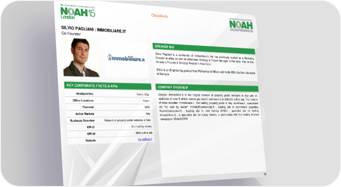 Classifieds SILVIO PAGLIANI | IMMOBILIARE.IT Co-Founder SPEAKER BIO Silvio Pagliani is a co-founder of Immobiliare.it. He has previously worked as a Marketing Director at eBay as well as eBusiness Strategy & Project Manager in Fiat Auto. Prior to that, hewasaProcess&StrategyAnalystinAccenture. Silvio is an Engineering gradute from Politecnico di Milano and holds MBA title from Università di Bologna KEY CORPORATE FACTS& KPIs COMPANY OVERVIEW Headquarters Rome, Italy Gruppo Immobiliare.it is the largest network of property portal websites in Italy with an Office Locations Rome audience of over 5 million visitors per month and more than 600.000 online ads. The network of sites includes: Immobiliare.it , the leading property portal in Italy. eureKasa.it , specialized Founded 2005 on "for sale by owner" ImmobiliCommerciali.it , leading site in commercial properties Active Markets Italy NuoveCostruzioni.it , leading site in new homes Affitti.it , specialist site for renting House24ore.it , a specialist site for luxury homes, in partnership with the leading financial Business Overview Network of property portal websites in Italy newspaperIlSole24ORE KPI #1 5mmonthlyvisitors KPI #2 600k online ads Website immobiliare.it 38