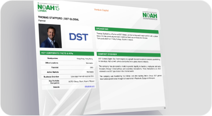 Venture Capital THOMAS STAFFORD | DST GLOBAL Partner SPEAKER BIO Thomas Stafford is a Partner at DST Global, an internet focused investment firm with a global focus. He has previously worked in Goldman Sachs as an Executive Director. TomgraduatedfromTrinity College, Dublin in Ireland. KEY CORPORATE FACTS& KPIs COMPANY OVERVIEW Headquarters HongKong, Hong Kong DST Global (Digital Sky Technologies) is a growth focused investment company specializing in late-stage, high-growth, private companies in the global Internet industry. Office Locations Worldwide Founded 2005 The company has pioneered a model to provide liquidity to founders, employees and early investors through mixed primary and secondary transactions. These transactions are often Active Markets Worldwide referred to as DST type deals in the Internet world. Business Overview Late-stage internetinvestment firm The company was founded by Yuri Milner, and after building Mail.ru Group, DST gained KeyPortfolio international prominence through its investments in Facebook, Zynga and Groupon. Companies AUTO1 Group, Slack, Xiaomi, Flipkart Website dst-global.com 23