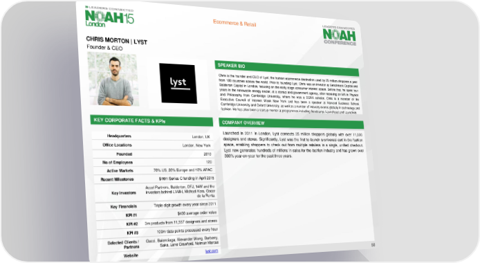 Ecommerce & Retail CHRIS MORTON| LYST Founder & CEO SPEAKER BIO Chris is the founder and CEO of Lyst, the fashion ecommerce destination used by 25 million shoppers a year from 180 countries across the world. Prior to founding Lyst, Chris was an investor at Benchmark Capital and Balderton Capital in London, focusing on the early-stage consumer internet space. Before that, he spent four years in the renewable energy sector, at a startup and government agency, after receiving an MA in Physics and Philosophy from Cambridge University, where he was a DERA scholar. Chris is a member of the Executive Council of Internet Week New York and has been a speaker at Harvard Business School, Cambridge University and Oxford University, as well as a number of industry events globally in technology and fashion. He has also been a startup mentor at programmes including Seedcamp,Launchpadand Launch48. KEY CORPORATE FACTS& KPIs COMPANY OVERVIEW Launched in 2011 in London, Lyst connects 25 million shoppers globally with over 11,000 Headquarters London, UK designers and stores. Significantly, Lyst was the first to launch a universal cart in the fashion Office Locations London, New York space, enabling shoppers to check out from multiple retailers in a single, unified checkout. Founded 2010 Lyst now generates hundreds of millions in sales for the fashion industry and has grown over 300%year-on-year for the past three years. No of Employees 120 Active Markets 70% US, 20% Europe and 10% APAC Recent Milestones $40m Series C funding in April 2015 Accel Partners, Balderton, DFJ, 14W and the Key Investors investors behind LVMH, Michael Kors, Oscar de la Renta. KeyFinancials Triple digit growth every year since 2011 KPI #1 $400 average order value KPI #2 3mproducts from 11,557 designers and stores KPI #3 100mdata points processed every hour Selected Clients / Gucci, Balenciaga, Alexander Wang, Burberry, Partners Saks, Lane Crawford, Neiman Marcus Website lyst.com 50
