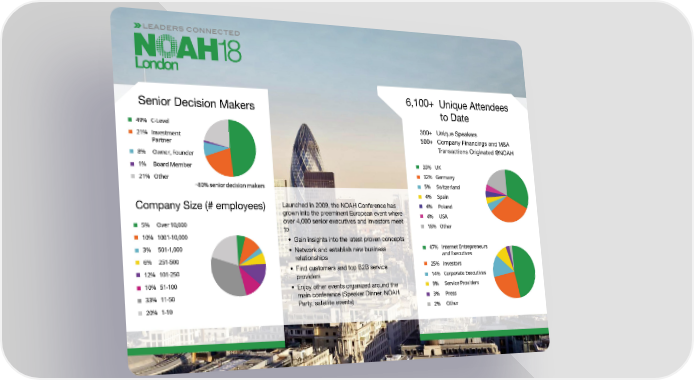 6,100+ Unique Attendees Senior Decision Makers to Date 49% C-Level 300+ Unique Speakers 21% Investment 500+ Company Financings and M&A Partner Transactions Originated @NOAH 8% Owner, Founder 1% Board Member 33% UK 21% Other 32% Germany ~80% senior decision makers 5% Switzerland 4% Spain Company Size (# employees) Launched in 2009, the NOAH Conference has 4% Poland grown into the preeminent European event where 4% USA 5% Over 10,000 over 4,000 senior executives and investors meet 18% Other to 10% 1001-10,000 • Gain insights into the latest proven concepts 3% 501-1,000 • Network and establish new business 47% Internet Entrepreneurs 6% 251-500 relationships and Executives 12% 101-250 • Find customers and top B2B service 25% Investors providers 14% Corporate Executives 10% 51-100 • Enjoy other events organized around the 9% Service Providers 33% 11-50 main conference (Speaker Dinner, NOAH 3% Press 20% 1-10 Party, satellite events) 2% Other 6