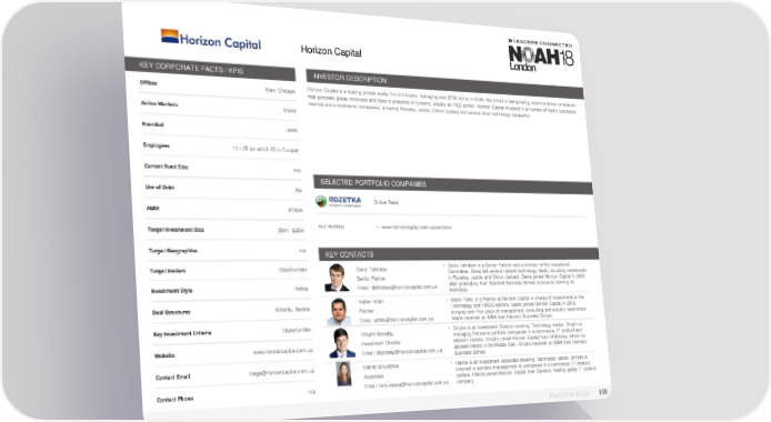 Horizon Capital KEY CORPORATE FACTS / KPIS INVESTOR DESCRIPTION Offices Kiev, Chicago Horizon Capital is a leading private equity firm in Ukraine, managing over $700 million in AUM. Weinvest in fast-growing, export-oriented companies that generate global revenues and have a presence in Ukraine, usually an R&D center. Horizon Capital invested in a number of highly successful internet and e-commerce companies, including Rozetka, Jooble, Ciklum (exited) and several other technology companies. Active Markets Global Founded 2005 Employees 11 - 25 (of which 25 in Europe) Current Fund Size n/a SELECTED PORTFOLIO COMPANIES Use of Debt No Online Retail AUM $750m Target Investment Size $5m - $25m Full Portfolio • www.horizoncapital.com.ua/portfolio/ Target Geographies n/a KEY CONTACTS Target Sectors Opportunistic Denis Tafintsev • Denis Tafintsev is a Senior Partner and a member of the Investment Committee. Denis led several notable technology deals, including investments Senior Partner in Rozetka, Jooble and Ciklum (exited). Denis joined Horizon Capital in 2010 Investment Style Active Email: dtafintsev@horizoncapital.com.ua after graduating from Stanford Business School previosuly working for McKinsey. Deal Structures Minority, flexible Vasile Tofan • Vasile Tofan is a Partner at Horizon Capital in charge of investments in the Partner Technology and FMCG sectors. Vasile joined Horizon Capital in 2012, bringing over five years of management consulting and industry experience. Email: vtofan@horizoncapital.com.ua Vasile received an MBA from Harvard Business School. Key Investment Criteria Opportunistic • Dmytro is an Investment Director covering Technology sector. Dmytro is Dmytro Boroday managing Horizon's portfolio companies in e-commerce, IT product and Website www.horizoncapital.com.ua Investment Director telecom sectors. Dmytro joined Horizon Capital from McKinsey, where he Email: dboroday@horizoncapital.com.ua advised clients in the Middle East. Dmytro received an MBA from Harvard Business School Contact Email tbega@horizoncapital.com.ua Hanna Shuvalova • Hanna is an Investment Associate covering Technology sector. Dmytro is Associate involved in portfolio management of companies in e-commerce, IT product sectors. Hanna joined Horizon Capital from Genesis, leading global IT product Contact Phone n/a Email: hshuvalova@horizoncapital.com.ua company INVESTOR BOOK 138