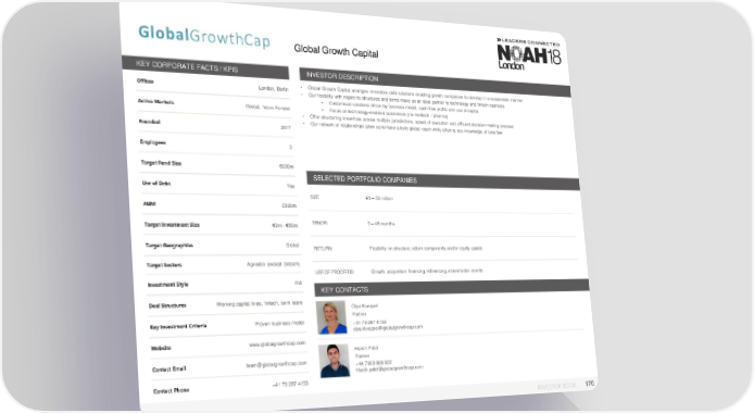 Global Growth Capital KEY CORPORATE FACTS / KPIS INVESTOR DESCRIPTION Offices London, Berlin • Global Growth Capital arranges innovative debt solutions enabling growth companies to develop in a sustainable manner. • Our flexibility with regard to structures and terms make us an ideal partner to technology and fintech business. • Customised solutions driven by business model, cash flow profile and use of capital Active Markets Global, focus Europe • Focus on technology-enabled businesses (no medtech / pharma) • Offer structuring know-how across multiple jurisdictions, speed of execution and efficient decision-making process Founded 2017 • Our network of relationships allow us to have a trully global reach while offering you knowledge of local law Employees 3 Target Fund Size €500m SELECTED PORTFOLIO COMPANIES Use of Debt Yes SIZE: €3– 50million AUM €300m Target Investment Size €3m - €50m TENOR: 3–48months Target Geographies Global RETURN: Flexibility on structure, return components and/or equity upside Target Sectors Agnostic (except biotech) USE OFPROCEEDS: Growth, acquisition financing, refinancing, shareholder events Investment Style n/a KEY CONTACTS Deal Structures Working capital lines, fintech, term loans OlyaKlueppel Partner Key Investment Criteria Proven business model +41792974153 olya.klueppel@globalgrowthcap.com Website www.globalgrowthcap.com Harsh Patel Contact Email team@globalgrowthcap.com Partner +447903888632 Harsh.patel@globalgrowthcap.com Contact Phone +41 79 297 4153 INVESTOR BOOK 170
