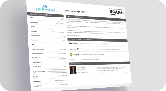 Berlin Technologie Holding KEY CORPORATE FACTS / KPIS INVESTOR DESCRIPTION Offices Berlin Berlin Technologie Holding (“BTH”) is a German based Holding and growth investment firm focused exclusively on investments in technology and technology-enabled businesses. BTH was founded by successful entrepreneurs and investors who invest in companies with significant growth potential. Active Markets Austria, Germany BTH provides growth capital, management know how and access to high caliber entrepreneurial partner network to companies facing strategic or Founded 2013 operational challenges. BTHstrongly believes that entrepreneurs with character deserve capital with character and thus invests own equity and also provide their experience Employees 4 - 10 (of which all in Europe) and network to those that distinguish themselves and their business model through clarity. Current Fund Size n/a Theycall it Augmented Capital. SELECTED PORTFOLIO COMPANIES Use of Debt Yes Sensorberg provides Beacon-software based on-the-fly IoT networks AUM n/a Target Investment Size €500k - €3m Digital front end platform that maximizes the quality, performance, and reach of customer interface Target Geographies Austria, Germany Germany’s largest private cash payment infrastructure Target Sectors Financial Services, Marketing, Analytics, Digital Services Full Portfolio • www.berlinholding.com/#portfolio-jump Investment Style Active KEY CONTACTS Deal Structures Flexible Joern-Carlos Kuntze • Seasoned Strategy, Company Builder and Corporate Finance expert. Serial Team with strong Execution Mindset, Managing Director Entrepreneur. Previously Partner at OC&C and Oliver Wyman Key Investment Criteria disruptive B2B Business Model, Financial • Companies: Sevenval, Minodes, Applause, PressMatrix Model with Recurring Revenues Email: jck@berlinholding.con Website www.berlinholding.com Contact Email contact@berlinholding.com Contact Phone +49 30707190203 INVESTOR BOOK 24