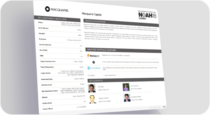 Macquarie Capital KEY CORPORATE FACTS / KPIS INVESTOR DESCRIPTION Offices Sydney, New York, London, San Macquarie Group Ltd. is a leading provider of banking, financial, advisory, investment and funds management services through its six core Francisco, Hong Kong and others segments: Macquarie Funds Group, Corporate and Asset Finance, Banking and Financial Services Group, Macquarie Securities Group, Macquarie Capital; and Fixed Income, Currencies and Commodities. Active Markets Global Macquarie Capital is the merchant banking segment of Macquarie and provides M&A and restructuring advisory and debt and equity capital raising Founded 2000 services to corporate and government clients. In addition, Macquarie Capital deploys a principal / merchant banking strategy and invests debt, structured debt and equity and common equity capital in companies in its focus sectors of TMT, industrials, infrastructure, financial institutions, gaming and leisure, real estate, and resources. Employees 1,136 (as of March 2017) Current Fund Size n/a Use of Debt Yes SELECTED PORTFOLIO COMPANIES AUM n/a Takeaway.com is an online food delivery marketplace Target Investment Size $20m - $200m IO.com provides modular data center technology and services for enterprises, governments and service providers. Target Geographies Global CommonBond is an online lending platform that connects borrowers and investors to make education finance better Infrastructure, Utilities and Reneables, Target Sectors Real Estate, TMT, Media, Entertainment & Tech, Resources, Industrials Full Portfolio • www.macquarie.com Investment Style Active & Passive KEY CONTACTS Deal Structures Flexible Market Leading, High Growth, Best-In- Ben Bailey Elmar Broscheit Key Investment Criteria Class, Management, Mature Companies, Head of EMEA TMT Senior Vice President Cash Flow Characteristics, Late Growth Website www.macquarie.com Stephan Feilhauer Constantine Manos Contact Email n/a Senior Vice President Senior Vice President Contact Phone +1 212 2310409 INVESTOR BOOK 161