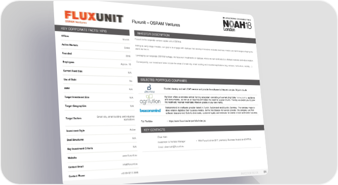 Fluxunit – OSRAM Ventures KEY CORPORATE FACTS / KPIS INVESTOR DESCRIPTION Offices Munich Fluxunit is the corporate venture capital unit of OSRAM. Active Markets Global Acting as early stage investor, our goal is to engage with startups that develop innovative, scalable business models and technologies shaping the world we live in. Founded 2016 Leveraging our corporate OSRAM heritage, we focus our investments on startups, where we can contribute to a startup’s success and value creation. Employees Approx. 10 Consequently, our investment fields include the areas of smart city, smart building and industrial applications (e.g. sensors, horticulture, mobility,…) Current Fund Size N/A Use of Debt No SELECTED PORTFOLIO COMPANIES AUM N/A Blickfeld develop and sell LiDAR sensors and provide the software to interpret complex 3d point clouds. Target Investment Size N/A Agrilution offers a complete vertical farming ecosystem consisting of a smart plug’n’play home-growing appliance and consumables, as well as an App that eliminates the need for a green thumb. Thereby we enable you to grow the healthiest, freshest most taste intensive greens in your own home. Target Geographies N/A Beaconsmind is a software provider based in Zurich, Switzerland and Munich, Germany. The company helps in- store retailers digitalize their business models. As the first iBeacon full-service provider, the company use their software beaconsmind Suite to drive sales, customer loyalty and revenues for clients in brick-and-mortar business. Target Sectors Smart city, smart building and industrial applications Full Portfolio • https://www.fluxunit.eu/en/portfolio/index.jsp Investment Style Active KEY CONTACTS Deal Structures N/A Oliver Kahl Investment & Portfolio Manager • With Fluxunit since 2017, previsouly Business Analyst at eCAPITAL Key Investment Criteria N/A Email: [email protected] Website www.fluxunit.eu Contact Email [email protected] Contact Phone +49 89 6213 3646 INVESTOR BOOK 54