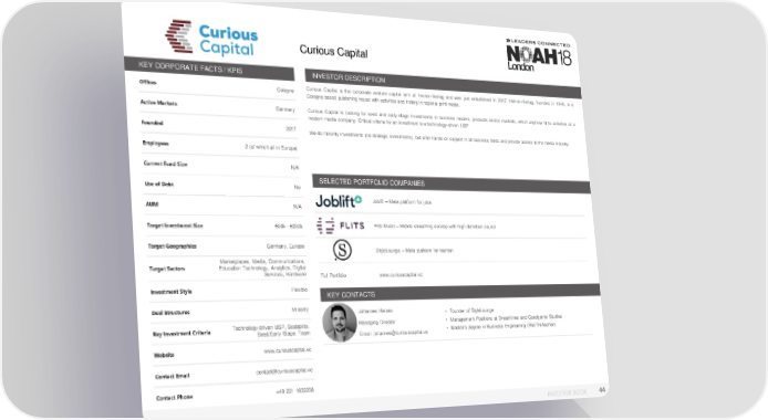 Curious Capital KEY CORPORATE FACTS / KPIS INVESTOR DESCRIPTION Offices Cologne Curious Capital is the corporate venture capital arm of Heinen-Verlag and was just established in 2017. Heinen-Verlag, founded in 1946, is a Cologne-based publishing house with activities and history in regional print media. Active Markets Germany Curious Capital is looking for seed and early stage investments in business models, products and/or markets, which anyhow fit to activities of a modern media company. Critical criteria for an investment is a technology-driven USP. Founded 2017 Wedominority investments (no strategic investments), but offer hands-on support in all business fields and provide access to the media industry. Employees 2 (of which all in Europe) Current Fund Size N/A Use of Debt No SELECTED PORTFOLIO COMPANIES Joblift – Meta platform for jobs AUM N/A Target Investment Size €50k - €250k Flits Music – Mobile streaming service with high definition sound Target Geographies Germany, Europe StyleLounge – Meta platform for fashion Marketplaces, Media, Communications, Target Sectors Education Technology, Analytics, Digital Services, Hardware Full Portfolio www.curiouscapital.vc Investment Style Flexible KEY CONTACTS Deal Structures Minority Johannes Heinen • Founder of StyleLounge Key Investment Criteria Technology-driven USP, Scalability, Managing Director • Management Positions at Dreamlines and Goodgame Studios Seed/Early Stage, Team Email: johannes@curiouscapital.vc • Master’s degree in Business Engineering (RWTH Aachen) Website www.curiouscapital.vc Contact Email contact@curiouscapital.vc Contact Phone +49 221 1632208 INVESTOR BOOK 44
