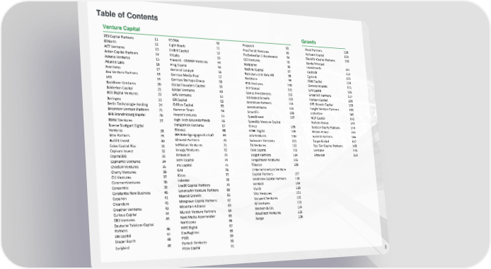 Table of Contents Venture Capital Growth 3TS Capital Partners 11 ECONA 50 Project A 92 Accel Partners 128 83North 12 Eight Roads 51 PropTech1 Ventures 93 Activant Capital 129 ACT Ventures 13 Endeit Capital 52 ProSiebenSat.1 Accelerator 94 BlackFin Capital Partners 130 Acton Capital Partners 14 FJ Labs 53 QD Ventures 95 Burda Principal Astutia Ventures 15 Fluxunit - OSRAM Ventures 54 Redalpine 96 Investments 131 Atlantic Labs 16 Frog Capital 55 Redline Capital 97 CapitalD 132 Aventures 17 General Catalyst 56 Red-stars.com data AG 98 Egmont 133 Axa Venture Partners 18 German Media Pool 57 Redstone 99 EMK Capital 134 b10 19 German Startups Group 58 RTA Ventures 100 General Atlantic 135 BackBone Ventures 20 Global Founders Capital 59 RTP Global 101 GPI Capital 136 Balderton Capital 21 Global Ventures 60 Samos Investments 102 Great Hill Partners 137 BCG Digital Ventures 22 GPS Ventures 61 Schibsted Growth 103 Horizon Capital 138 Beringea 23 GR Capital 62 Seventure Partners 104 HPE Growth Capital 139 Berlin Technologie Holding 24 Griffon Capital 63 SevenVentures 105 Insight Venture Partners 140 Bessemer Venture Partners 25 Hammer Team 64 SmartFin 106 LetterOne 141 BFB Brandenburg Kapital 26 Hearst Ventures 65 SpeedInvest 107 NGP Capital 142 BMW iVentures 27 High-Tech Gruenderfonds 66 SpeedUp Venture Capital NuCom Group 143 Boerse Stuttgart Digital Holtzbrinck Ventures 67 Group 108 Scottish Equity Partners 144 Ventures 28 i5invest 68 STIHL Digital 109 Stripes Group 145 btov Partners 29 IBB Beteiligungsgesellschaft 69 STS Ventures 110 Summit Partners 146 Buildit Invest 30 Idinvest Partners 70 Swisscom Ventures 111 Target Global 147 Caixa Capital Risc 31 InMotion Ventures 71 TA Ventures 112 Top Tier Capital Partners 148 Caphorn Invest 32 Innogy Ventures 72 Talis Capital 113 Verdane 149 Capital300 33 Innovo.vc 73 Target Partners 114 Vitruvian 150 Capnamic Ventures 34 Intel Capital 74 Tengelmann Ventures 115 Check24 Ventures 35 Iris Capital 75 Tiburon 116 Cherry Ventures 36 ISAI 76 Unternehmertum Venture Citi Ventures 37 Kizoo 77 Capital Partners 117 CommerzVentures 38 Lakestar 78 Vealerian Capital Partners 118 Concentric 39 LeadX Capital Partners 79 Ventech 119 Constantia New Business 40 Levensohn Venture Partners 80 Via ID 120 Coparion 41 Maersk Growth 81 Vito Ventures 121 Creandum 42 Mangrove Capital Partners 82 Vorwerk Ventures 122 Creathor Ventures 43 Mountain Alliance 83 W Ventures 123 Curious Capital 44 Munich Venture Partners 84 Wecken & Cie. 124 DB1 Ventures 45 Next Media Accerlerator 85 WestTech Ventures 125 Deutsche Telekom Capital Northzone 86 Xange 126 Partners 46 NWZ Digital 87 DN Capital 47 OneRagtime 88 Draper Esprit 48 P101 89 Earlybird 49 Partech Ventures 90 Piton Capital 91 3