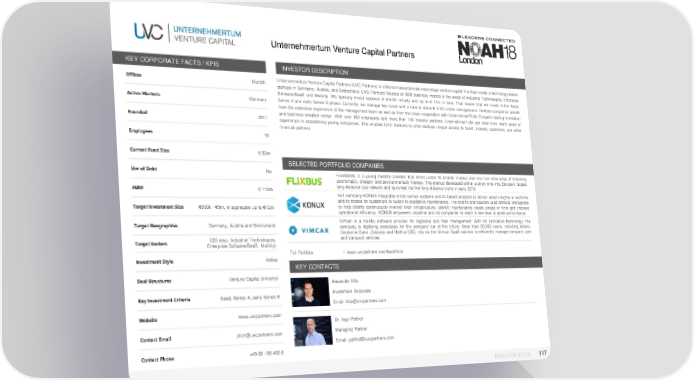 Unternehmertum Venture Capital Partners KEY CORPORATE FACTS / KPIS INVESTOR DESCRIPTION Offices Munich UnternehmertumVenture Capital Partners (UVC Partners) is a Munich-based private early-stage venture capital firm that invests in technology-based startups in Germany, Austria, and Switzerland. UVC Partners focuses on B2B business models in the areas of Industrial Technologies, Enterprise Software/SaaS and Mobility. We typically invest between € 0.5-3m initially and up to € 12m in total. That means that we invest in the Seed, Active Markets Germany Series A and early Series B phase. Currently, we manage two funds with a total of about € 110m under management. Portfolio companies benefit from the extensive experience of the management team as well as from the close cooperation with UnternehmerTUM, Europe's leading innovation Founded 2011 and business creation center. With over 180 employees and more than 100 industry partners, UnternehmerTUM can draw from many years of experience in establishing young companies. This enables UVC Partners to offer startups unique access to talent, industry customers, and other financial partners. Employees 10 Current Fund Size € 83m SELECTED PORTFOLIO COMPANIES Use of Debt No FlixMobility is a young mobility provider that offers under its brands FlixBus and FlixTrain new ways of travelling comfortably, cheaply and environmentally friendly. The startup developed within a short time into Europe’s largest AUM € 110m long-distance bus network and launched the first long-distance trains in early 2018. IIoT company KONUX integrates smart sensor systems and AI-based analytics todeliver asset insights in real time and to enable its customers to switch to predictive maintenance. The end-to-end solution uses artificial intelligence Target Investment Size €500k - €3m, in aggregate up to €12m to help clients continuously monitor their infrastructure, identify maintenance needs ahead of time and improve operational efficiency. KONUX empowers industrial and rail companies to reach a new level of asset performance. Target Geographies Germany, Austria and Switzerland Vimcar is a holistic software provider for logbooks and fleet management. With its innovative technology, the company is digitizing processes for the company car of the future. More than 30,000 users, including Allianz, Deutsche Bahn, Zalando and Hertha BSC, rely on the Vimcar SaaS solution to efficiently manage company cars Target Sectors B2B (esp. Industrial Technologies, and transport vehicles. Enterprise Software/SaaS, Mobility) Full Portfolio • www.uvcpartners.com/#portfolio Investment Style Active KEY CONTACTS Deal Structures Venture Capital (minority) Alexander Kiltz Photo Investment Associate Key Investment Criteria Seed, Series A, early Series B Email: kiltz@uvcpartners.com Website www.uvcpartners.com Dr. Ingo Potthof Contact Email pitch@uvcpartners.com Photo Managing Partner Email: potthof@uvcpartners.com Contact Phone +49 89 189 469 0 INVESTOR BOOK 117