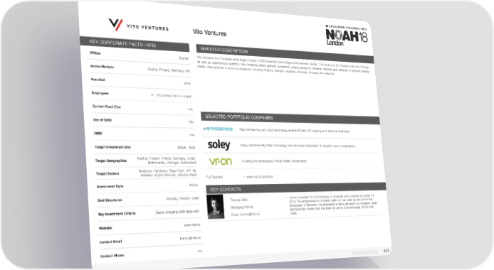 Vito Ventures KEY CORPORATE FACTS / KPIS INVESTOR DESCRIPTION Offices Munich Vito Ventures is a European early-stage investor in B2B deep-tech technologies and business models. The focus is on AI, Robotics, Internet of Things as well as autonomous systems. Vito Ventures offers portfolio companies unique access to industrial markets and networks in German leading SMEs.Vitos portfolio is home to companies including Crate.io, micropsi industries, Simscale, Wirepas and Artisense. Active Markets Austria, Finland, Germany, UK Founded 2015 Employees 4 - 10 (of which all in Europe) Current Fund Size n/a SELECTED PORTFOLIO COMPANIES Use of Debt No Machine learning and cloud technology enable efficient 3D mapping and real-time localization AUM n/a Target Investment Size €500k - €3m Soley combines Big Data Technology with Workflow Automation for tangible value in engineering Target Geographies Austria, Finland, France, Germany, Israel, A startup for professional Virtual Reality collaboration Netherlands, Portugal, Switzerland Target Sectors Analytics, Hardware, Deep-Tech, IoT, AI, Robotics, Cyber Security, Industry SaaS Full Portfolio • www.vito.vc/portfolio/ Investment Style Active KEY CONTACTS Deal Structures Minority, Flexible, Lead Thomas Oehl • Tommy founded his first company in university and successfully exited it in 2013. His entrepreneurial mindset made him join Uber as one of the first Key Investment Criteria Game changing B2B deep-tech Managing Partner employees in Germany. He developed a native attraction to innovative ideas and business models and has been an active business angel for the past Email: tommy@vito.vc years Website www.vito.vc Contact Email tommy@vito.vc Contact Phone n/a INVESTOR BOOK 121