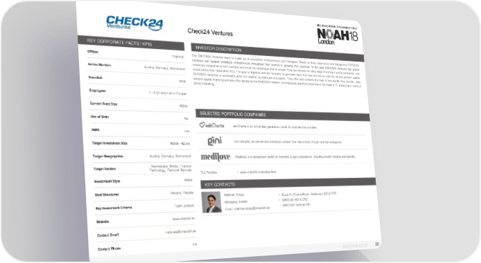 Check24 Ventures KEY CORPORATE FACTS / KPIS INVESTOR DESCRIPTION Offices Frankfurt The CHECK24 Ventures team is made up of successful entrepreneurs and managers. Based on their experience and background CHECK24 Ventures can support ambitious entrepreneurs throughout their journey in growing their business. In the past CHECK24 Ventures has guided numerous companies to their success and know the challenges that lie ahead. They are focused on early stage financing of young companies and Active Markets Austria, Germany, Switzerland invest earlier than most other VCs. The goal is, together with the founders, to generate value from day one and as such do not only provide capital. CHECK24 Ventures is successful when the backed founders are successful. They offer and combine the best of two worlds: they provide early Founded 2016 venture capital financing and also offer access to the CHECK24 network, its employees and their know how in the fields of IT, product and online & offline marketing. Employees 1 - 3 (of which all in Europe) Current Fund Size €60m SELECTED PORTFOLIO COMPANIES Use of Debt No askCharlie is an online lead generation portal for local service providers AUM n/a Target Investment Size €500k - €2.5m Gini extracts, structures and processes content from documents through artificial intelligence Target Geographies Austria, Germany, Switzerland Medilove is a comparison portal for cosmetic surgery procedures, including breast implants and facelifts. Target Sectors Marketplace, Media, Financial Technology, Fianncial Services Full Portfolio • www.check24.vc/en/#portfolio Investment Style Active KEY CONTACTS Deal Structures Minority, Flexible Matthias Orlopp • Scout 24 (FinanceScout, Autoscout) MD & CFO Key Investment Criteria Team, product Managing Director • CHECK24 MD & CFO Email: matthias.orlopp@check24.de • CHECK24 Ventures MD Website www.check24.vc Contact Email ventures@check24.de Contact Phone n/a INVESTOR BOOK 35