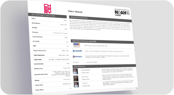 Cherry Ventures KEY CORPORATE FACTS / KPIS INVESTOR DESCRIPTION Offices Berlin They are entrepreneurs, focusing on seed stage companies and investing across Europe. The goal is to add value from day one, not just capital. They are successful if their founders are successful. Cherry Ventures will do anything in their power to make that happen. They provide advice for key strategic issues as well as day-to-day management tasks. They offer support to build-up strong functional units across the complete company Active Markets Europe, Israel value chain and provide access to personal network for the recruitment of key positions. They also coach entrepreneurs, connect founders (with key external partners especially in marketing, operations and IT) and support founders in preparing, running investor pitches, structuring deals (cash-for- Founded 2012 equity, media-for-equity, etc.) and in negotiating future financing rounds. Employees 11 - 25 (of which 12 in Europe) Current Fund Size €150m Use of Debt No SELECTED PORTFOLIO COMPANIES AUM n/a AUTO1 Group is a used car purchaser based in Berlin Target Investment Size €400k - €10m Caroobi is a vertical marketplace for instant booking of car repair and maintenance services Target Geographies Europe, Israel, Turkey Enmacc aims to become the world’s leading OTC marketplace for energy trading by connecting all market participants via a highly scalable tech-platform Target Sectors Technology, Technology-enabled services Investment Style Active Full Portfolio • www.cherry.vc/portfolio Deal Structures Flexible, Lead KEY CONTACTS Industry agnostic, early-stage, first Christian Meermann • After some years at The Boston Consulting Group, Christian joined Zalando institutional investor, disruptive as their first CMO. He then joined the Management Board of Peek&Clop and Key Investment Criteria technology, solve specific problem for Founding Partner was responsible for the company’s online business consumer • After several years with McKinsey Daniel co-founded CityDeal and led the Daniel Glasner company as CEO until the acquisition through Groupon in 2010. Daniel is Website www.cherry.vc Founding Partner founder of Quandoo, a SaaS company for restaurants that was sold to Recruit Holdings in March’15 Contact Email team@cherry.vc Filip Dames • Filip founded his first company in 2008, an online auction house for antiques and collectibles. He then joined the founding team of Zalando and held Founding Partner several executive positions. Contact Phone n/a INVESTOR BOOK 36