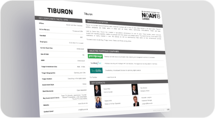 Tiburon KEY CORPORATE FACTS / KPIS INVESTOR DESCRIPTION Offices Munich and San Francisco Tiburon is a private German-American seed investment boutique with a focus on early stage startups in the digital sector. Tiburon’s portfolio companies are mostly active in areas such as media, mobile, communities, meta-platforms, Fintech and SaaS. Active Markets Europe and USA Lead by Daniel Wild, Tiburon has invested in high-potential entrepreneurs for over 15 years. These founders receive continuous support with marketing expertise, creation of synergies within the network and strategic advice. They benefit from the Tiburon team's broad experience of having invested in over 150 startups as well as accompanying those teams on their entrepreneurial journeys. Founded 2001 Successful exits include Xing, Trivago, Invoco, Cadooz and Smava, among others. Employees 6 (of which 4 in Europe) Current Fund Size Undisclosed SELECTED PORTFOLIO COMPANIES Use of Debt No Develops and sells secure cloud based video streaming and management solutions to businesses AUM Undisclosed Effortless recruiting with intelligent HR-Tech Solutions. The biggest law recruiting platform in Germany. Target Investment Size €60k - €180k Crowdtesting & cloudbased Solutions for optimizing digital products Target Geographies Germany and USA Target Sectors Everything in the digital space Full Portfolio • www.tiburon.de Investment Style Active KEY CONTACTS Deal Structures Case dependent Daniel Wild Felix Artmann CEO & Founder Managing Partner Team-Fit (diversity, experience), Founder- Key Investment Criteria Market-Fit (expertise, unfair advantage), Tiburon-Fit (trust, levers) Alexander Juergens Website www.tiburon.de Tatjana Wild Investment Manager Partner & FinTech Specialist juergens@tiburon.de Contact Email info@tiburon.de INVESTOR BOOK 116