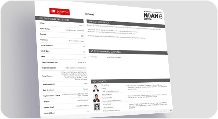 i5invest KEY CORPORATE FACTS / KPIS INVESTOR DESCRIPTION Offices Vienna i5invest is an international tech investor and business accelerator. Wesupport start-ups and founders in industries we are very experienced in with: Active Markets Austria, Germany, Switzerland - Seed Capital: Wehelp you right from the start, and like being the first investors in your company - Advisory & Supervisory Roles: Wehelp seed stage companies become the next big thing Founded 2007 Wehavecompleted +100international transactions & exits and operate out of our Vienna and Palo Alto offices. Employees 11 - 25 (of which 25 in Europe) Current Fund Size n/a Use of Debt No SELECTED PORTFOLIO COMPANIES AUM n/a Full Portfolio • www.i5invest.com/deals/ Target Investment Size €500k - €1m Target Geographies Austria, Germany, Switzerland, UK E-Commerce Technology, Marketplaces, Media, Communications, EdTech, Travel Target Sectors & Transportation, Gaming, Gambling, Health, Marketing, Analytics, Digital Services, Hardware Investment Style Active KEY CONTACTS Henry Morley • Henry is Director at i5invest with a background in Corporate Strategy / Deal Structures Flexible Director Finance and brings strong connections to the London tech scene and financial services industry Email: [email protected] Key Investment Criteria Scalable software with a B2B focus and a world class team Sotero Rodriguez Senior Associate • Business Development and M&A Advisor for i5invest, focused on deep tech Website www.i5invest.com companies using computer vision & AR/VR technologies Email: [email protected] Contact Email [email protected] Simona Huebl • Simona is Director at i5growth and part of the early stage board at i5invest Early Stage Board with a focus on driving international growth of high potential European tech Contact Phone n/a companies Email: [email protected] INVESTOR BOOK 68