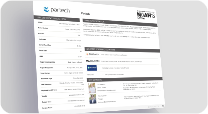 Partech KEY CORPORATE FACTS / KPIS INVESTOR DESCRIPTION Offices San Francisco, Paris, Berlin, Dakar Partech is a global investment firm with offices in San Francisco, Paris, Berlin and Dakar. Webring together capital, operational experience and strategic support for entrepreneurs at seed, venture and growth stages across multiple continents, with over $1.3B investment capacity. Active Markets Europe, USA, Africa, SEA Investments range from $200K to $50M in a wide range of technologies and businesses for enterprises and consumers, from software, digital brands and services, to hardware and deep tech across all major industries. Founded 1982 Companies backed by Partech have completed more than 20 initial public offerings and more than 50 strategic exits above $100M. Employees 55 of which 46 in Europe Current Fund Size $1.3bn SELECTED PORTFOLIO COMPANIES Use of Debt No Global leader in social media listening and analytics AUM $1.5bn Target Investment Size Seed, Venture & Growth Online home furnishing retailer with HQ in the UK and expanding across Europe Target Geographies Europe, USA, Africa, SEA The leading European marketplace for Do-It-Yourself Target Sectors Tech & Digital across all sectors Full Portfolio • www.partechpartners.com/companies/ Investment Style Active (hands-on) KEY CONTACTS Deal Structures Majority, Minority, Flexible, Joint Control, Lead Omri Benayoun • Omri Benayoun is General Partner at Partech, responsible for the Growth General Partner fund. He joined in May 2014. Key Investment Criteria Team. Market. Model. Momentum • He currently sits on the boards of Brandwatch, M-Files, EcoVadis, obenayoun@partechpartners.com SendinBlue and NA-KD. Website www.partechpartners.com Victor Huberson Contact Email media@partechpartners.com Principal • Victor Huberson is Principal at Partech, focusing on Growth investments. He joined Partech in October 2017. vhuberson@partechpartners.com Contact Phone +33 1 53 65 65 53 INVESTOR BOOK 90