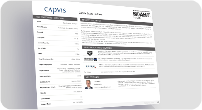 Capvis Equity Partners KEY CORPORATE FACTS / KPIS INVESTOR DESCRIPTION Offices Baar, Frankfurt, Shanghai Capvis Equity Partners AG is the exclusive advisor to the Capvis Funds and is domiciled in Baar, Switzerland, with a subsidiary in Frankfurt and a representative office in Shanghai. The team is supported by a broad network of industry sector specialists. The primary point of contact for companies, investors, management and the public is Capvis Equity Partners AG. Active Markets Switzerland, Germany and Austria The Management Team of Capvis Equity Partners AG looks back on a success story of over 15 years. The team established the Capvis I Fund in Founded 1990 1999 and founded the management company Capvis Equity Partners AG. Capvis is the successor organization of SBC Equity Partners. From 1995 until the merger of UBS and Swiss Bank Corporation SBC in 1998, SBC Equity Partners was the Private Equity investment division of Swiss Bank Corporation. Before 1995, the investments were made by the equity banking division of Swiss Bank Corporation. Employees 11 - 50 Capvis has been fully independent since 2003. The Capvis Management team has been working together for many years and looks back on a track record that spans over two decades. Since Current Fund Size €720m 1990,Capvis has concluded 52 transactions with a total volume of more that EUR 5 billion. Use of Debt Yes SELECTED PORTFOLIO COMPANIES arena is one of the world’s reference brands in aquatic sports. For over 40 years, arena has equipped the world’s Olympic gold medallists and watersport lovers with racing, training and leisure swimwear built on a foundation of AUM €1.9bn technology and innovation. (Fund Capvis III) Target Investment Size €50m - €500m VAT Holding AG is the global market leader in the development, manufacture and sale of vacuum valves for the semiconductor and vacuum coating industries. (Fund Capvis IV) Target Geographies Switzerland, Germany and Austria RENA is a global leading supplier of production equipment for wet chemical surface treatment. RENA products are used in the areas of application Renewable Energy, Medical and Electronics. (Fund Capvis IV) Service/Trading, Engineering, Consumer Target Sectors Goods, Industrial Goods, Electronics, Automotive Supplier, Chemicals Full Portfolio • www.capvis.ch/en/capvis-funds/structure-capvis-funds-overview.html Investment Style Active KEY CONTACTS Deal Structures Majority, Minority Jens Abend • Jens has been working with Capvis since 2016. Jens was previously CEO of Market Advisor LR-Health & Beauty Systems GmbH, Ahlen and spent over 15 years at Key Investment Criteria Dynamic entrepreneurialism focused on McKinsey & Company. Inc. Jens was a member of the board at Fielmann AG. achieving ambitious targets Email: jens.abend@capvis.com Jens holds a Dr. rer. pol., from the University of Augsburg. Website www.capvis.ch Contact Email n/a Contact Phone +44 1534780789 INVESTOR BOOK 156