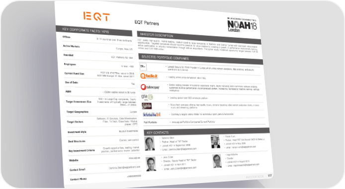 EQT Partners KEY CORPORATE FACTS / KPIS INVESTOR DESCRIPTION Offices In 14 countries over three continents EQT seeks high-quality, market-leading, medium-sized to large companies in Northern and Central Europe with significant value-creation opportunities. Targeted companies should have the potential for value creation by investing in growth, in performance improvement, and e.g. active participation in industry consolidation through add-on acquisitions. The typical equity investment opportunity ranges between EUR 50 Active Markets Europe, Asia, US million and EUR 1000 million. Founded EQT Partners AB 1994 SELECTED PORTFOLIO COMPANIES Employees In total: ~562 • Largest Secure SD-WAN Provider in Europe which unites network operations, data analytics, and security operations as a service Current Fund Size EQT VIII: €10.75bn, raised in 2018 • Leading online price comparison site in Italy EQT MM Europe: €1.6bn, raised 2017 Use of Debt Yes • Global leading provider of customer experience mgmt., digital marketing and e-commerce software enabling customers to drive performance via personalized content, increasingly facilitated by machine learning / artificial AUM ~ €50bn capital raised in 26 funds intelligence Mid – to Large-Cap companies, Equity • Leading global hotel B2B wholesale platform Target Investment Size investments will typically range between • Music-tech company offering high-quality music, primarily targeting video content production clients, in-store €50m –€1,000m music and streaming platforms Target Geographies Europe • Germany’s largest online retailer for automotive spare parts & accessories Software, IT Services, Data Monetization, Target Sectors Fiber, FinTech, Classifieds / Market Full Portfolio • www.eqt.se/Portfolio-Companies/Current-Portfolio/ places / OPC Investment Style Buyout Investments KEY CONTACTS Deal Structures Control, joint control • Dominik Stein • Florian Funk • Partner, Head of TMT Sector • Partner, Head EQT Mid Market DACH & BeNeLux Key Investment Criteria Growth opportunities, leading market • Joined EQT in September 2006 • Joined EQT in May 2008 position, performance improv. potential • Email: [email protected] • Email: [email protected] Website www.eqt.se • Jens Zuber • Hajo Krösche • Director, Deputy Head of TMT Sector • Director Contact Email [email protected] • Joined EQT in April 2011 • Joined EQT in August 2013 • Email: [email protected] • Email: [email protected] Contact Phone +46850655300 INVESTOR BOOK 157