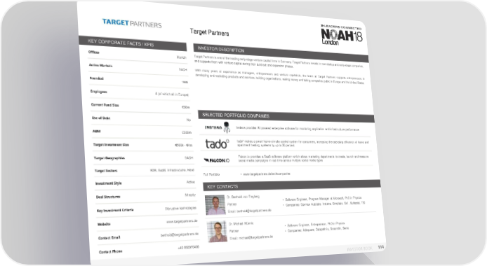 Target Partners KEY CORPORATE FACTS / KPIS INVESTOR DESCRIPTION Offices Munich Target Partners is one of the leading early-stage venture capital firms in Germany. Target Partners invests in new startup and early-stage companies, and supports them with venture capital during their build-out and expansion phases. Active Markets DACH With many years of experience as managers, entrepreneurs and venture capitalists, the team at Target Partners supports entrepreneurs in developing and marketing products and services, building organizations, raising money and taking companies public in Europe and the United States. Founded 1999 Employees 8 (of which all in Europe) Current Fund Size €68m SELECTED PORTFOLIO COMPANIES Use of Debt No Instana provides AI powered enterprise software for monitoring application and infrastructure performance AUM €300m tado° makes a smart home climate control system for consumers, increasing the operating efficiency of home and Target Investment Size €500k - €4m apartment heating systems by up to 30 percent Target Geographies DACH Falcon.io provides a SaaS software platform which allows marketing departments to create, launch and measure social media campaigns in real time across multiple social media types Target Sectors B2B, SaaS, Infrastrucutre, Hard Full Portfolio • www.targetpartners.de/en/#companies Investment Style Active KEY CONTACTS Deal Structures Minority Dr. Berthold von Freyberg Partner • Software Engineer, Program Manager at Microsoft, PhD in Physics Key Investment Criteria Disruptive technologies • Companies: German Autolabs, Instana, Simplaex, So1, Suitepad, TIS Email: berthold@targetpartners.de Website www.targetpartners.de Dr. Michael Münnix Contact Email berthold@targetpartners.de Partner • Software Engineer, Entrepreneur, PhD in Physics • Companies: Adsquare, Datapath.io, Swarm64, Senic Email: michael@targetpartners.de Contact Phone +49 892070490 INVESTOR BOOK 114