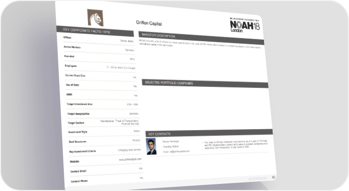 Griffon Capital KEY CORPORATE FACTS / KPIS INVESTOR DESCRIPTION Offices Tehran, Berlin MENAfund with a bit of a focus on unique opportunities in Iran post JCPOA. We've either invested in or helped key players in this market access international capital in the last 4 years. Active Markets Germany Founded 2014 Employees 11 - 25 (of which 3 in Europe) Current Fund Size n/a SELECTED PORTFOLIO COMPANIES Use of Debt No AUM n/a Target Investment Size €1m - €3m Target Geographies Germany Target Sectors Marketplaces, Travel & Transportation, Financial Services Investment Style Active KEY CONTACTS Deal Structures Minority Xanyar Kamangar • Four years of EM tech investment track record on top of 8 years of TMT M&A Key Investment Criteria Emerging local winners Founding Partner and IPO (Deutsche Bank London) and 9 years of successful entrepreneurship experience. Iran 'Entrepreneur of year' award in 2003 Email: xk@griffoncapital.com Website www.griffoncapital.com Contact Email n/a Contact Phone n/a INVESTOR BOOK 63