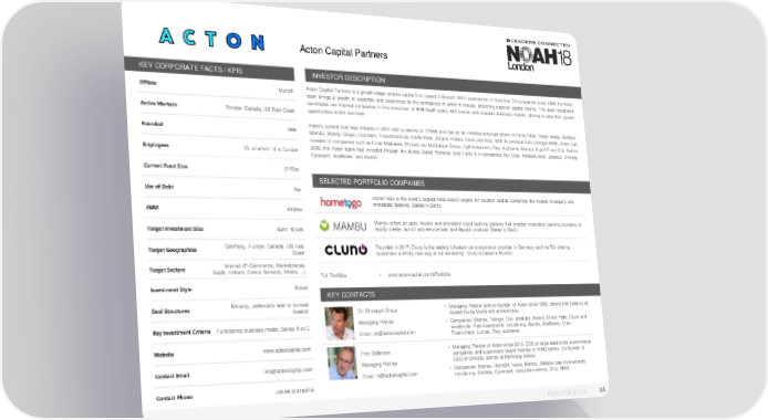 Acton Capital Partners KEY CORPORATE FACTS / KPIS INVESTOR DESCRIPTION Offices Munich Acton Capital Partners is a growth-stage venture capital firm, based in Munich. With investments in more than 70 companies since 1999, the Acton team brings a wealth of expertise and experience to the companies in which it invests, delivering superior capital returns. The ideal investment candidates are Internet companies in the consumer or B2B-SaaS space with proven and scalable business models, striving to take their growth Active Markets Europe, Canada, US East Coast opportunities to the next level. Founded 1999 Acton’s current fund was initiated in 2014 with a volume of 170m€ and has so far invested amongst others in HomeToGo, Tictail, iwoca, GetSafe, Mambu, Mobify, Eloquii, Comatch, Finanzcheck.de, Chefs Plate, Zenjob, Freska, Cluno and Koio. With its previous fund (vintage 2008), Acton had invested in companies such as Linas Matkasse, Windeln.de, MyOptique Group, mytheresa.com, Etsy, Audibene, Momox, KupiVIP and Clio. Before Employees 15, of which 14 in Europe 2008, the Acton team had invested through the Burda Digital Ventures fund I and II in companies like Ciao, HolidayCheck, Zooplus, OnVista, Cyberport, AbeBooks and Alando. Current Fund Size €170m SELECTED PORTFOLIO COMPANIES Use of Debt No HomeToGo is the world’s largest meta search engine for vacation rentals combining the models of enquiry and AUM €400m immediate booking. Based in Berlin. Mambu offers an agile, flexible and affordable cloud banking platform that enables innovative banking providers to Target Investment Size €3m - €15m rapidly create, launch and service loan and deposit products. Based in Berlin. Target Geographies Germany, Europe, Canada, US East Founded in 2017, Cluno is the leading full-stack car subscription provider in Germany and the EU, offering Coast customers a wholly new way of car ownership. Cluno is based in Munich. Target Sectors Internet (E-Commerce, Marketplaces, SaaS, Fintech, Online Services, Media, ...) Full Portfolio • www.actoncapital.com/#Portfolio Investment Style Active KEY CONTACTS Deal Structures Minority, preferrably lead or co-lead • Managing Partner and co-founder of Acton since 1999, before that treasury at investor Dr. Christoph Braun Hubert Burda Media and at McKinsey. Key Investment Criteria Functioning business model, Series A to C Managing Partner • Companies: Momox, Tolingo, Clio, sofatutor, Mobify, Chefs Plate, Cluno and Email: cb@actoncapital.com windeln.de. Past investments include e.g. Alando, AbeBooks, Ciao, Finanzcheck, Lumas, Etsy, audibene. Website www.actoncapital.com • Managing Partner of Acton since 2013. CEO of large electronics e-commerce Fritz Oidtmann companies and supervisory board member of XING before. Co-founder & Contact Email info@actoncapital.com Managing Partner CEO of OnVista, partner at McKinsey before. Email: fo@actoncapital.com • Companies: Momox, Home24, iwoca, Mambu. Notable past involvements include e.g. OnVista, Cyberport, computeruniverse, Chip, XING. Contact Phone +49 89 2421887-0 INVESTOR BOOK 14