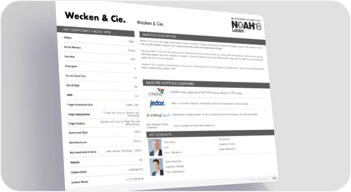 Wecken& Cie. KEY CORPORATE FACTS / KPIS INVESTOR DESCRIPTION Offices Basel Wecken&Cie.is an early-stage venture capital investor, focused on European fast-growing, disruptive technology companies, with expertise in Deep Techand B2BSoftware. Wecken&Cie. invests across other sectors and stages opportunistically. Active Markets Europe Having invested in more than 40 companies since 2007 and thereof successfully exited e.g. Delivery Hero and EcoIntense, Wecken & Cie. typically participates together with other institutional investors in Series A investment rounds with €500k to €3m initially, with the ability to provide additionally Founded 2007 capital over the life of the investment. Wecken&Cie. is backed by Klaus Wecken, co-founder of multiple startups in the technology and real-estate sector, most prominently KHK Software Employees 8 which he sold to SAGE Group in 1997. Current Fund Size n/a SELECTED PORTFOLIO COMPANIES Use of Debt No CYNORA develops highly efficient TADF OLED emitting materials for OLED displays. AUM n/a Target Investment Size €500k - €5m Jedox is a business intelligence and corporate performance management solutions provider. Target Geographies Europe (with focus on Germany and RankingCoach provides solutions for SMEs to optimize their Online Marketing, SEO and Social Media. Switzerland) Target Sectors Agnostic (with focus on Deep Tech and B2B Software) More Selected Portfolio www.crunchbase.com/organization/wecken-cie Companies Investment Style Active KEY CONTACTS Deal Structures Minority Frank Hölzle Thilo Schmid Photo CEO Investment Director Key Investment Criteria Team, Market, Technology, Traction Email: ts@care4.ch Email: fh@care4.ch Website n/a Georg Kampmann Contact Email info@care4.ch Photo Investment Manager Email: glk@care4.ch Contact Phone +41 61 555 03 30 INVESTOR BOOK 124