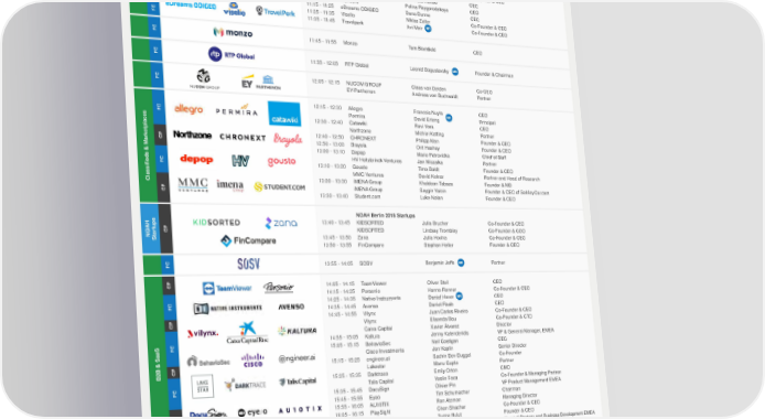 MAIN STAGE - Day 2 31 October SESSION TITLE COMPANY TIME COMPANY SPEAKER POSITION Breakfast 8:00 - 10:00 K 9:30 - 9:35 Day 1 Summary ® NOAH Advisors Marco Rodzynek Founder & CEO FC 9:35 - 9:45 Gett Dave Waiser MR Founder & CEO 9:45 - 10:05 AUTO1 Group Hakan Koç MR Co-Founder & Co-CEO CP 10:05 - 10:15 Cars24 Vikram Chopra Founder & CEO 10:15 - 10:25 Frontier Car Group Sujay Tyle Co-Founder & CEO FC 10:25 - 10:35 Carwow James Hind Founder & CEO Balderton Capital Rob Moffat Partner 10:35 - 10:45 Via Daniel Ramot Co-Founder & CEO 10:45 - 10:55 Glovo Oscar Pierre Co-Founder & CEO ravel & Mobility 10:55 - 11:05 Lastminute.com Group Fabio Cannavale CEO T CP 11:05 - 11:15 Wanderu Polina Raygorodskaya CEO 11:15 - 11:25 eDreams ODIGEO Dana Dunne CEO 11:25 - 11:35 Viselio Niklas Zeller Co-Founder & CEO FC 11:35 - 11:45 Travelperk Avi Meir MR Co-Founder & CEO FC 11:45 - 11:55 Monzo Tom Blomfield CEO FC 11:55 - 12:05 RTP Global Leonid Boguslavsky MR Founder & Chairman 12:05 - 12:15 NUCOM GROUP Claas van Delden Co-CEO FC EY-Parthenon Andreas von Buchwaldt Partner 12:15 - 12:30 Allegro Francois Nuyts CEO Permira David Erlong MR Principal FC 12:30 - 12:40 Catawiki Ravi Vora CEO Northzone Michiel Kotting Partner 12:40 - 12:50 CHRONEXT Philipp Man Founder & CEO CP 12:50 - 13:00 Brayola Orit Hashay Founder & CEO 13:00 - 13:10 Depop Marie Petrovicka Chief of Staff HV Holtzbrinck Ventures Jan Miczaika Partner FC 13:10 - 13:20 Gousto Timo Boldt Founder & CEO MMC Ventures David Kelnar Partner and Head of Research Classifieds & Marketplaces 13:20 - 13:30 iMENA Group Khaldoon Tabaza Founder & MD CP iMENA Group Saygin Yalcin Founder & CEO of SellAnyCar.com 13:30 - 13:40 Student.com Luke Nolan Founder & CEO NOAH Berlin 2018 Startups 13:40 - 13:45 KIDSORTED Julia Brucher Co-Founder & CEO CP KIDSORTED Lindsay Trombley Co-Founder & COO NOAHStartups 13:45 - 13:50 Zana Julia Hoxha Co-Founder & CEO 13:50 - 13:55 FinCompare Stephan Heller Founder & CEO FC 13:55 - 14:05 SOSV Benjamin Joffe MR Partner CP 14:05 - 14:15 TeamViewer Oliver Steil CEO 14:15 - 14:25 Personio Hanno Renner Co-Founder & CEO 14:25 - 14:35 Native Instruments Daniel Haver MR CEO FC 14:35 - 14:45 Avenso Daniel Raab CEO 14:45 - 14:55 Vilynx Juan Carlos Riveiro Co-Founder & CEO CP Vilynx Elisenda Bou Co-Founder & CTO Caixa Capital Xavier Álvarez Director 14:55 - 15:05 Kaltura Jenny Kalenderidis VP & General Manager, EMEA FC 15:05 - 15:15 BehavioSec Neil Costigan CEO Cisco Investments Jon Koplin Senior Director 15:15 - 15:25 engineer.ai Sachin Dev Duggal Co-Founder B2B & SaaSCP Lakestar Manu Gupta Partner 15:25 - 15:35 Darktrace Emily Orton CMO FC Talis Capital Vasile Foca Co-Founder & Managing Partner 15:35 - 15:45 DocuSign Olivier Pin VP Product Management EMEA 15:45 - 15:55 Eyeo Tim Schumacher Chairman 15:55 - 16:05 AU10TIX Ron Atzmon Managing Director CP 16:05 - 16:15 PlaySight Chen Shachar Co-Founder & CEO 16:15 - 16:25 Streetbees Tugce Bulut Founder & CEO FC PepsiCo Paul Kelly Head of Strategy and Business Development EMEA CP 16:25 - 16:35 Job Today Polina Frolova-Montano COO ech 16:35 - 16:45 Coople Viktor Calabrò Founder & Executive Chairman FC 16:45 - 16:55 Jobandtalent Juan Urdiales Co-Founder & Co-CEO HR T DN Capital Thomas Rubens Partner CP CP 16:55 - 17:05 Ashoka Matthias Scheffelmeier Partner, Germany CP 17:05 - 17:15 PTScientists Robert Böhme Founder & CEO K 17:15 - 17:20 Closing Note ® NOAH Advisors Marco Rodzynek Founder & CEO Lunch served between 12:00 - 13:30 CP Company K Keynote P Panel FC Fireside MR Interview / Panel with participation of Marco Presentation Chat Rodzynek Founder & CEO, NOAH Advisors