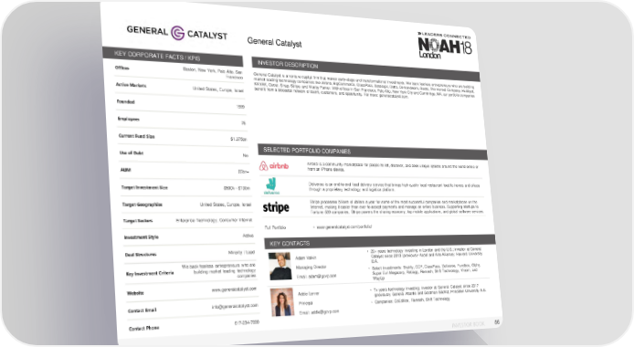 General Catalyst KEY CORPORATE FACTS / KPIS INVESTOR DESCRIPTION Offices Boston, New York, Palo Alto, San General Catalyst is a venture capital firm that makes early-stage and transformational investments. Weback fearless entrepreneurs who are building Francisco market leading technology companies like Airbnb, BigCommerce, ClassPass, Datalogix, Datto, Demandware, Gusto, The Honest Company, HubSpot, KAYAK,Oscar,Snap,Stripe, and Warby Parker. With offices in San Francisco, Palo Alto, New York City and Cambridge, MA, our portfolio companies Active Markets United States, Europe, Israel benefit from a bicoastal network of talent, customers, and opportunity. For more: generalcatalyst.com. Founded 1999 Employees 75 Current Fund Size $1.375bn SELECTED PORTFOLIO COMPANIES Use of Debt No Airbnb is a community marketplace for people to list, discover, and book unique spaces around the world online or AUM $5bn+ from an iPhone device. Target Investment Size $500k - $100m Deliveroo is an end-to-end food delivery service that brings high-quality local restaurant food to homes and offices through a proprietary technology and logistics platform. Target Geographies United States, Europe, Israel Stripe processes billions of dollars a year for some of the most successful companies and marketplaces on the Internet, making it easier than ever to accept payments and manage an online business. Supporting startups to Fortune 500 companies, Stripe powers the sharing economy, top mobile applications, and global software services. Target Sectors Enterprise Technology, Consumer Internet Full Portfolio • www.generalcatalyst.com/portfolio/ Investment Style Active KEY CONTACTS Deal Structures Minority / Lead • 20+ years technology investing in London and the U.S.; investor at General Adam Valkin Catalyst since 2013 (previously Accel and Arts Alliance); Harvard University We back fearless entrepreneurs who are Managing Director B.A. Key Investment Criteria building market leading technology • Select investments: Brainly, CCP, ClassPass, Deliveroo, Fundbox, Giphy, companies Email: adam@gcvp.com Super Evil Megacorp, Rebagg, Remesh, Shift Technology, Vroom, and Website www.generalcatalyst.com WayUp Addie Lerner • 7+ years technology investing; investor at General Catalyst since 2017 Contact Email info@generalcatalyst.com (previously General Atlantic and Goldman Sachs); Princeton University A.B. Principal • Companies: CoEdition, Remesh, Shift Technology Email: addie@gcvp.com Contact Phone 617-234-7000 INVESTOR BOOK 56