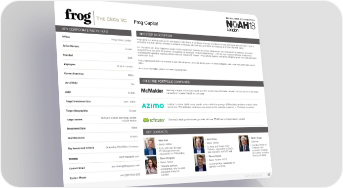 Frog Capital KEY CORPORATE FACTS / KPIS INVESTOR DESCRIPTION Offices Kings Cross, London Frog Capital is a leading scale-up VC, specialising in later Series A and Series B rounds, for software focused businesses across Europe. Frog is a committed long-term partner, investing in ambitious companies with revenues up to €30m and requiring up to €20m of growth capital. Active Markets Europe As ‘The CEO’s VC’, Frog Capital has a team of both experienced investors and former entrepreneurs who understand the challenges and needs facing CEOs as they grow the business. By applying our developed ‘Scale-Up Methodology’ – informed from industry knowledge, entrepreneur understanding, operating expertise and an extensive relationship network – Frog actively supports exceptional company growth and builds significant shareholder value. Founded 2008 Frog’s experienced team has invested in over 100 companies, and in the last six years has exited companies with a total transaction value over €1 billion. Employees 13 (all in London) For further information, please visit www.frogcapital.com. Current Fund Size €90m SELECTED PORTFOLIO COMPANIES Use of Debt No Germany’s largest online estate agent with 85% market share, McMakler has seen the total volume of real estate AUM €130m transactions increase fivefold in a just a year. Target Investment Size €5m - €20m Leading European digital money transfer service within the growing c.$700bn global remittance market, Azimo serves over 190 destination countries giving access to 5bn reachable customers in 77 different currencies. Target Geographies Europe Target Sectors Software enabled technology across Germany’s leading online tutoring provider, with over 75,000 ítems of digital learning content multiple sectors Investment Style Active KEY CONTACTS Deal Structures Minority • Mike Reid • Jens Düing • Martin Hauge Key Investment Criteria Generating €3m-€30m of revenue • Senior Partner • Senior Partner • Chairman • Ex-3i, with over 20 years’ • Ex Apax and Pioneer Point • Founding Partner of PE/VC experience and Partners, responsible for DACH Creandum and Website www.frogcapital.com responsible for IR/Marketing deal origination and B2C lead successful European • Shirin Dehghan • Steven Dunne VC investor: including Spotify and iZettle Contact Email jens.dueing@frogcapital.com • Senior Partner • Senior Partner & CFO • Telecoms software • Ex-Livingbridge, responsible for entrepreneur, who founded portfolio monitoring Contact Phone +44 (0)20 7833 0555 and exited Arieso for c.$100m INVESTOR BOOK 55