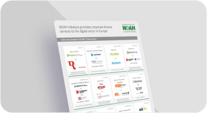 NOAH Advisors provides corporate finance services to the digital sector in Europe Selected Completed NOAH Transactions July 2018 August 2017 December 2016 October 2016 Sale of 100% in Acquisition of a Majority Stake in Investment in Investment in to by by by at a valuation of $200m 84% Ownership Exclusive Financial Advisor to Financial Advisor to EMK Capital Financial Advisor to Silver Lake Exclusive Financial Advisor to PromoFarma and its shareholders KäuferPortal and its Shareholders September 2016 May 2016 September 2015 July 2015 Acquisition of a Majority Stake in Investment in Sale of a 70% stake in Primary funding for 10Bis Drushim by from from by to at a valuation of €300m Financial Advisor to Oakley Capital Exclusive Financial Advisor to Exclusive Financial Advisor to Advisor to BIScience 10Bis and its Shareholders Drushim and its Shareholders December 2014 October 2014 September 2014 August 2014 Sale of 100% of Sale of 100% of Sale of controlling stake in for $800m to for €80m to to sale to Exclusive Financial Advisor to Exclusive Financial Advisor to Exclusive Financial Advisor to Advisor to the Selling Shareholders Fotolia and the Selling Shareholders Trovit and its Shareholders Facile.it and its Shareholders May 2014 February 2013 May 2012 April 2012 Sale of 100% in sold 100% of Growth equity investment from $150 million growth equity investment from to for $228m to a joint for a 30% stake venture between alongside Softonic’s Founders for a 50% stake alongside Fotolia’s and Angel Investors at a Founders and TA Associates Additional $150 million senior valuation of €275m debt financing Exclusive Financial Advisor to Yad2 Exclusive Financial Advisor to Financial Advisor to Fotolia and Financial Advisor to Toprural and its Shareholders Softonic and its shareholders its Shareholders and its Shareholders 6
