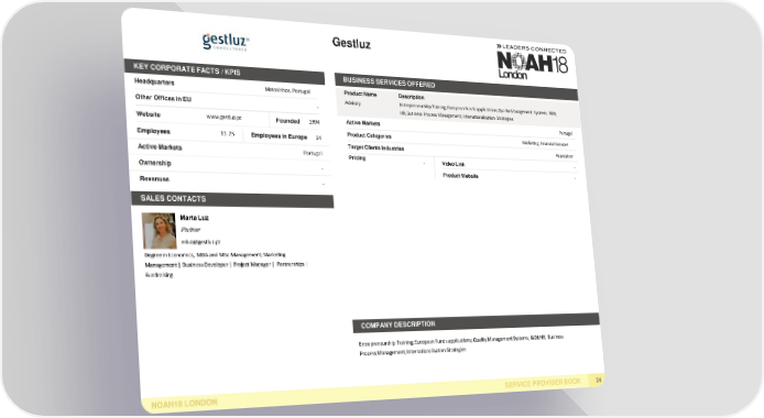 Gestluz KEY CORPORATE FACTS /KPIS BUSINESS SERVICESOFFERED Headquarters Matosinhos,Portugal ProductName Description Advisory Entrepreneurship Training; European Funds applications; Quality Management Systems; I&DI; Other Offices inEU - HR; Business Process Management; Internationalisation Strategies Website www.gestluz.pt Founded 1994 Active Markets Portugal Employees 11-25 Employeesin Europe 14 ProductCategories Marketing, FinancialServices Target ClientsIndustries Association Active Markets Portugal Pricing - VideoLink - Ownership - ProductWebsite - Revenues - SALESCONTACTS Marta Luz Partner [email protected] Degree in Economics, MBA and MSc Management; Marketing Management | Business Developer | Project Manager | Partnerships | Fundraising. COMPANYDESCRIPTION Entrepreneurship Training; European Funds applications; Quality Management Systems; I&DI; HR; Business Process Management; Internationalisation Strategies NOAH18LONDON SERVICE PROVIDERBOOK 34