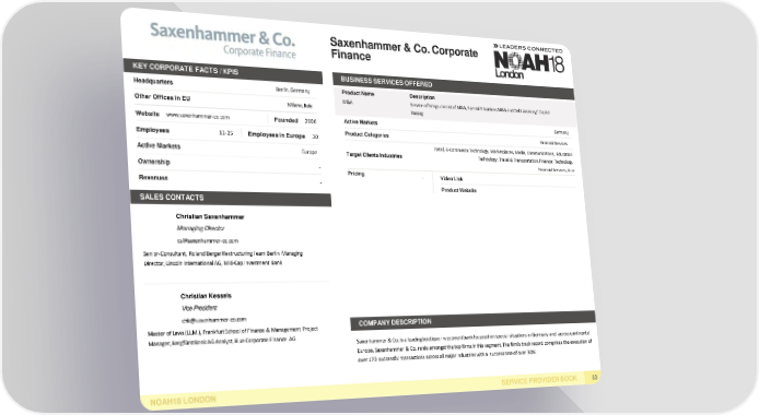 Saxenhammer & Co.Corporate Finance KEY CORPORATE FACTS /KPIS BUSINESS SERVICESOFFERED Headquarters Berlin,Germany ProductName Description M&A Service offerings consist of M&A, Special Situations M&A and Debt Advisory/ Capital Other Offices in EU Milano,Italy Raising Website www.saxenhammer-co.com Founded 2006 ActiveMarkets Germany Employees 11-25 EmployeesinEurope 30 ProductCategories FinancialServices Retail, E-Commerce Technology, Marketplaces,Media, Communications, Education Active Markets Europe Target ClientsIndustries Technology, Travel & Transportation, Financial Technology, Ownership - Financial Services,Gam Pricing - VideoLink Revenues - ProductWebsite SALESCONTACTS Christian Saxenhammer Managing Director cs@saxenhammer-co.com Senior-Consultant, Roland Berger Restructuring Team Berlin Managing Director, Lincoln International AG, Mid-Cap Investment Bank ChristianKessels VicePresident chk@saxenhammer-co.com Master of Laws (LL.M.), Frankfurt School of Finance & Management Project COMPANYDESCRIPTION Manager, Bergfürst Bank AG Analyst, Blue Corporate Finance AG Saxenhammer & Co. is a leading boutique investment bank focused on special situations in Germany and across continental Europe. Saxenhammer & Co. ranks amongst the top firms in this segment. The firm’s track record comprises the execution of over 170 successful transactions across all major industries with a success rate of over 90%. NOAH18LONDON SERVICE PROVIDERBOOK 53
