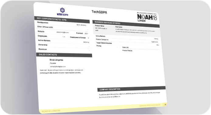 TechGDPR KEY CORPORATE FACTS /KPIS BUSINESS SERVICESOFFERED Headquarters Berlin,Germany Product Name Description Initial GDPR compliance A careful analysis of who your data subjects are, which data you store on them, where Other Offices inEU - audit you store this, and what your business processes are workflow are. Website www.techgdpr.com Founded 2017 Active Markets Germany Employees 1-3 Employeesin Europe 3 ProductCategories DigitalServices Active Markets Germany Target ClientsIndustries Other Ownership - Pricing - VideoLink - Revenues - ProductWebsite - SALESCONTACTS Silvan Jongerius Founder contact@techgdpr.com I have over 14 years of experience as an entrepreneur and in private technology/media education in senior leadership/tech positions. COMPANYDESCRIPTION A careful analysis of who your data subjects are, which data you store on them, where you store this, and what your business processes are workflow are. NOAH18LONDON SERVICE PROVIDERBOOK 58